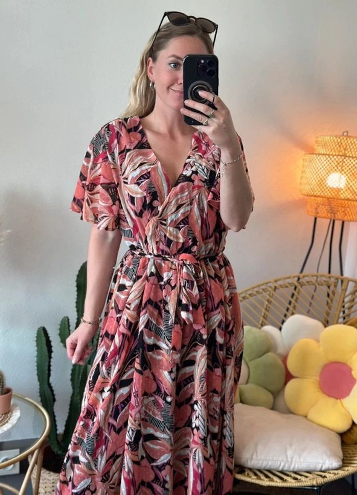 Belle robe longue évasée motifs fleuris corail rose clair taille 44/46 - La Halle - photo numéro 1