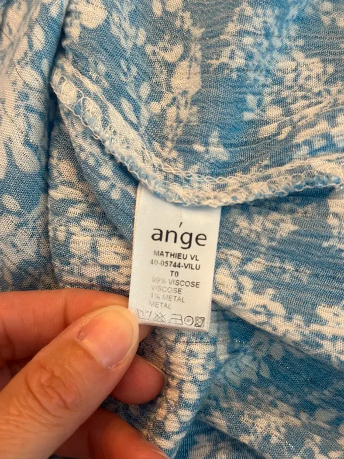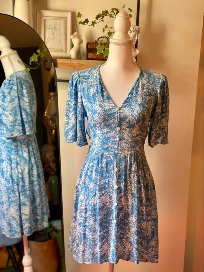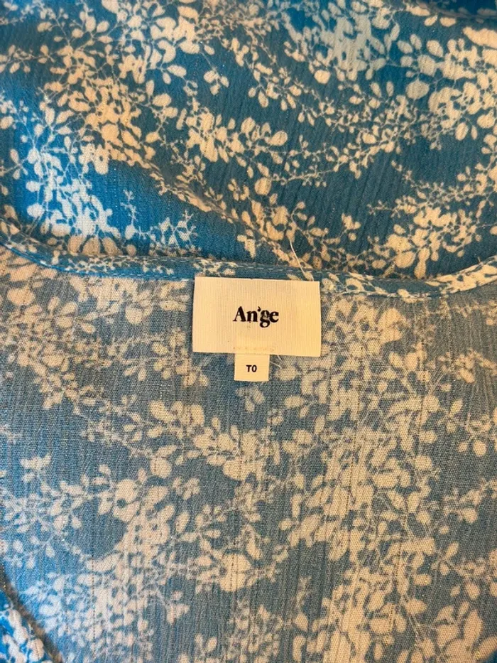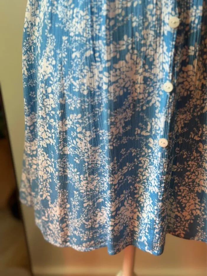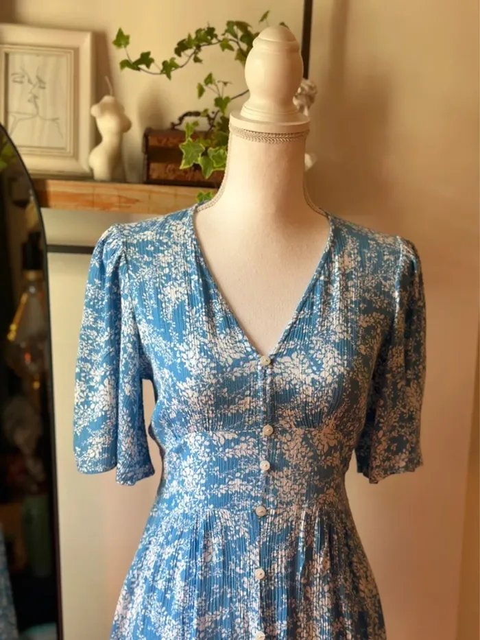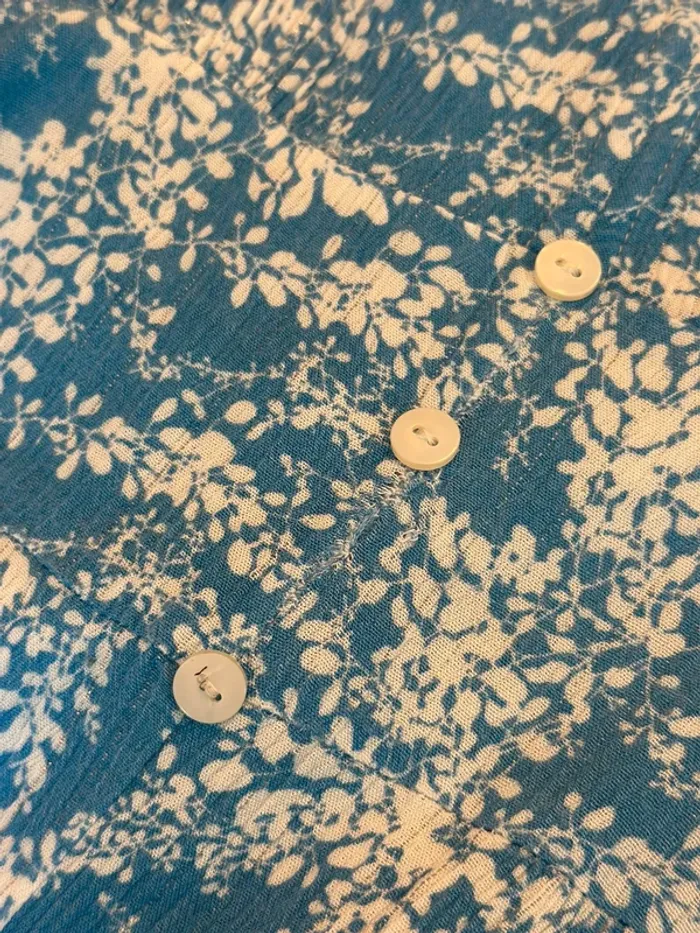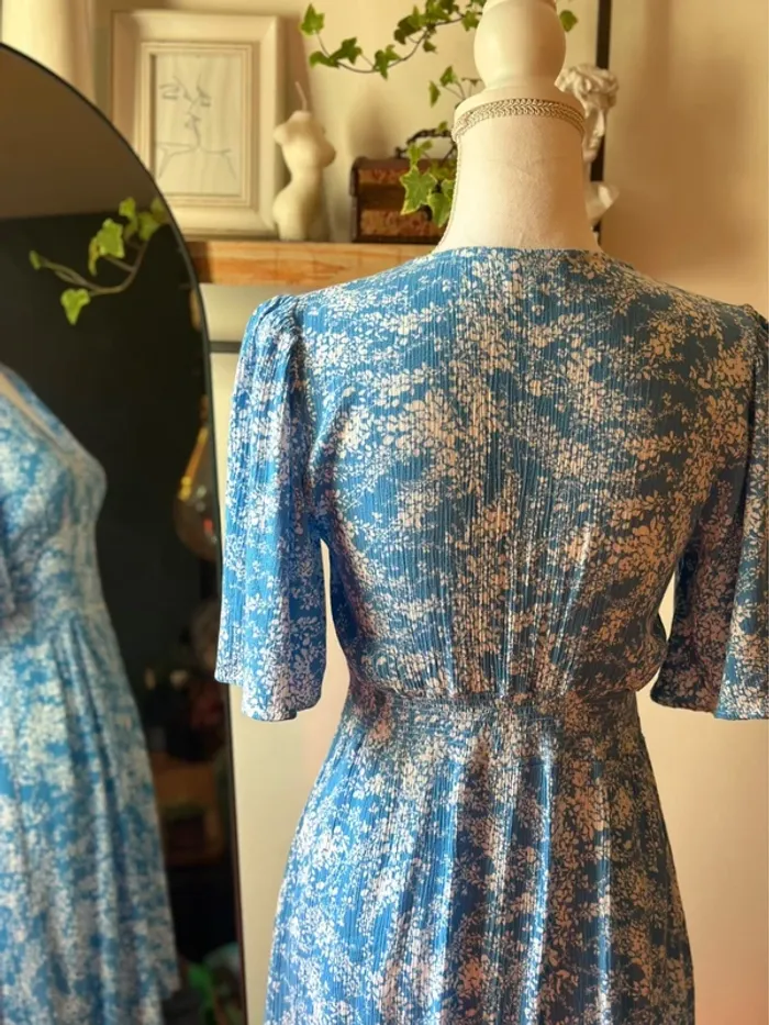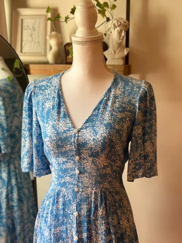Robe fluide, coloris bleu lumineux à imprimé floral blanc. Coupe évasée et ajustée sous la poitrine, longueur environ 85 cm. Décolleté en V avec boutonnage sur toute la hauteur, manches courtes légèrement évasées pour plus de confort. Matière légère et agréable (99 % viscose, 1 % fil métallique discret). Quelques points de couture ont été ajoutés au niveau de certains boutons (voir les deux dernières photos), travail soigné qui ne se remarque pas porté. ℹ️ Photo portée générée à titre illustratif, pour vous donner une idée du rendu.