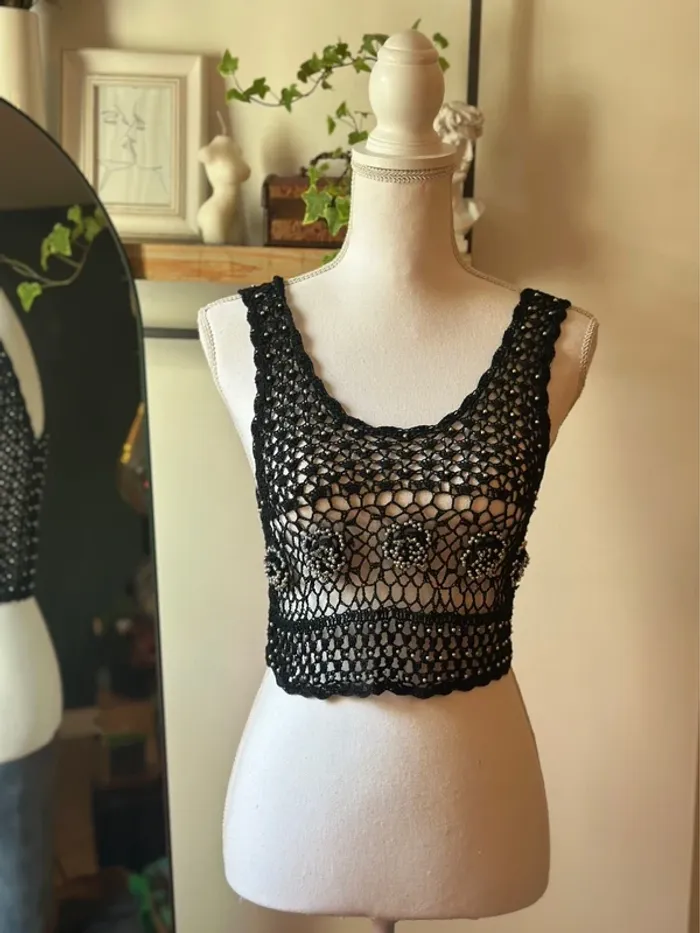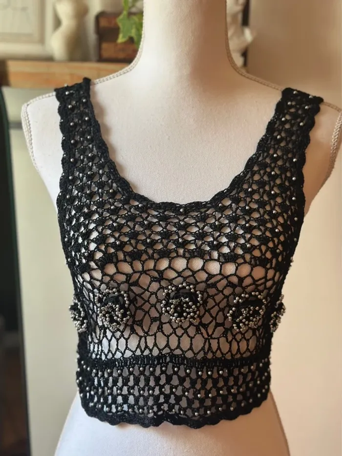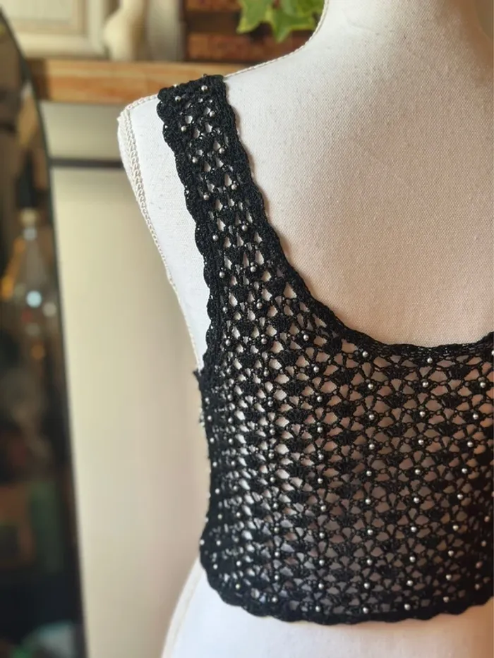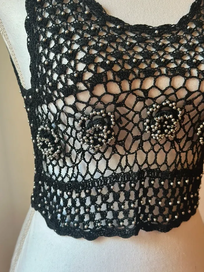 Top court crochet noir perles argentées – Taille S – Vintage - photo numéro 2