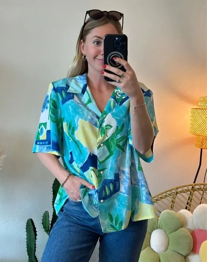 Chemise bleu, vert et jaune à motifs, modèle vintage, taille unique - Ge’vana