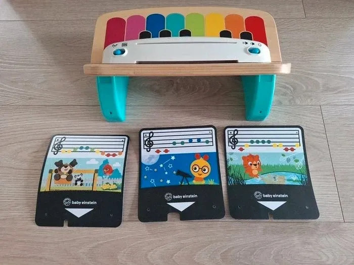 #piano en bois électronique de la marque Hape pour l'éveil musical des enfants à partir de 1 an. C'est un #jouet musical amusant et bien construit pour faire découvrir la musique aux tout-petits.  Il offre 2 possibilité à l’enfant : soit d’écouter des mélodies enregistrées en insérant la fiche avec le morceau choisi (6 morceaux au choix), soit de jouer sa propre musique en utilisant les touches de couleur. L’enfant peut alors utiliser les 3 partitions codées en couleurs pour jouer des chansons familières et s'initier au piano. Pas besoin de presser des touches pour jouer, il suffit de les effleurer pour emmètre un son. #lolamalo50jouet