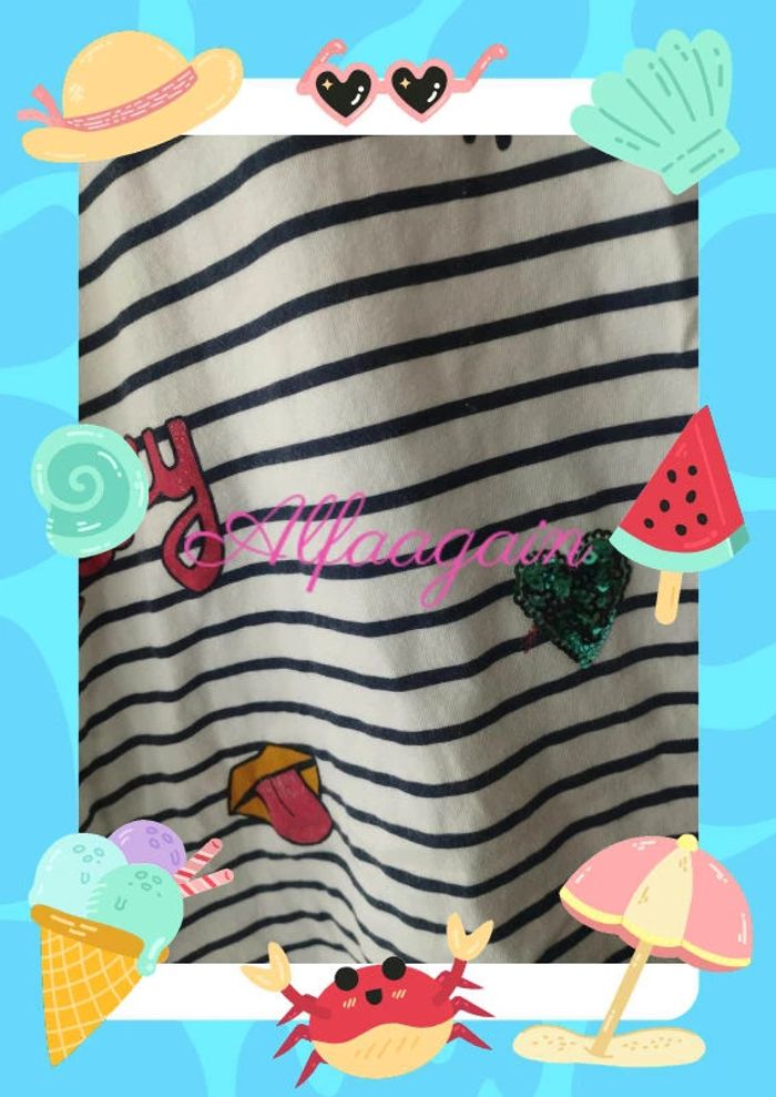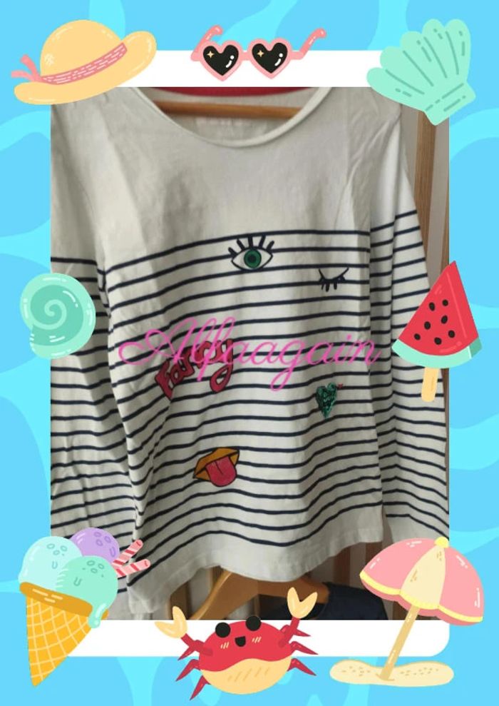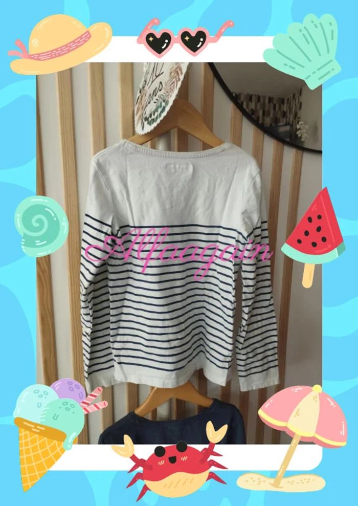 Lot de deux t-shirts manches longues, un extenso un tao . Tous les deux avec paillettes. Un bleu/gris anthracite et un blanc rayé. Point couture sur le bleu. A vendre 4€50 --------------------------- ✏️Informations générales ✏️ 📩Expédition dans la journée en général -hors weekend. 🚭Maison non fumeur / sans animaux 📅Pas de réservation 📸Pas de photo porté 👛 Bon plan Envoi à 99ct (+20% récupéré en bon d'achat) possible uniquement pour les français- me contacter pour plus d'infos 😉 #alfaagain10ansfille #tao #tapealoeil