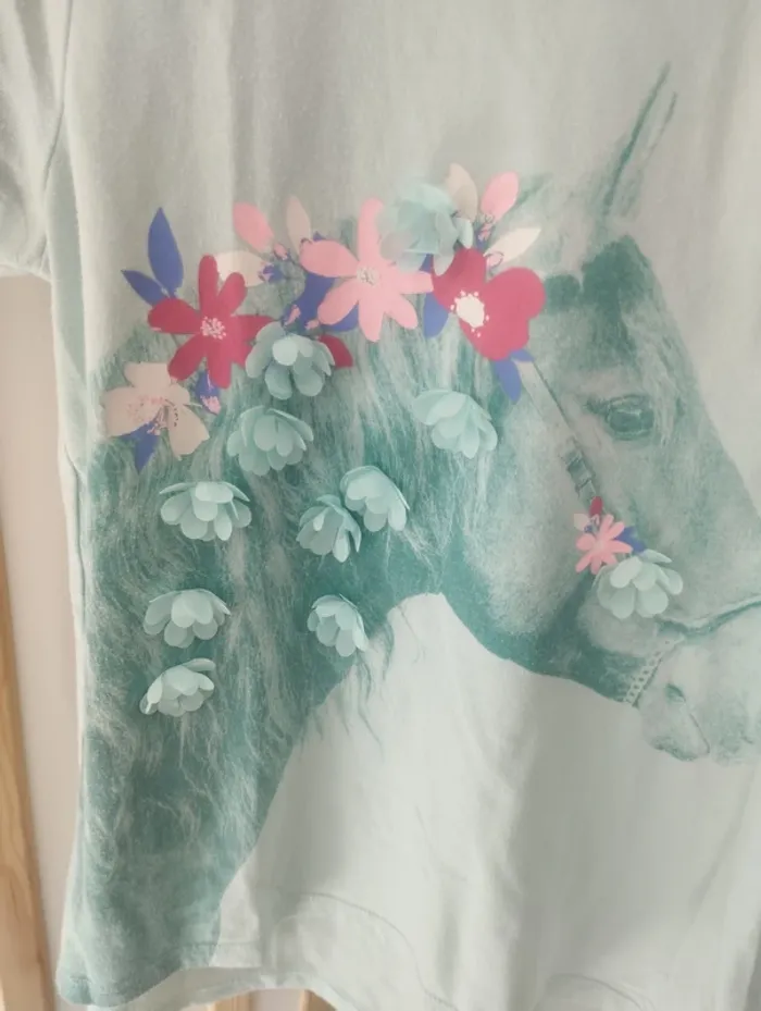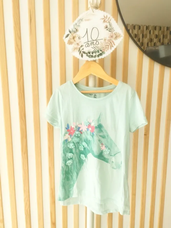T-shirt manches courtes bleu , tête de cheval avec fleurs . Taille 10ans , marque gap . Très bon état A vendre 5€ --------------------------- ✏️Informations générales ✏️ 📩Expédition dans la journée en général -hors weekend. 🚭Maison non fumeur / sans animaux 📅Pas de réservation 📸Pas de photo porté 👛 Bon plan Envoi à 99ct (+20% récupéré en bon d'achat) possible uniquement pour les français- me contacter pour plus d'infos 😉 #alfaagain10ansfille #gap
