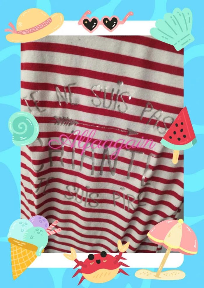 Très beau t-shirt manches courtes rayé rouge et blanc état comme neuf avec texte paillettes argentées. Taille 8ans . Étiquettes coupées . A vendre 4€50 --------------------------- ✏️Informations générales ✏️ 📩Expédition dans la journée en général -hors weekend. 🚭Maison non fumeur / sans animaux 📅Pas de réservation 📸Pas de photo porté 👛 Bon plan Envoi à 99ct (+20% récupéré en bon d'achat) possible uniquement pour les français- me contacter pour plus d'infos 😉 #alfaagain8ansfille