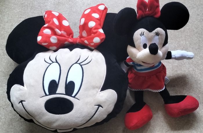 J'ai le plaisir de vous proposer ce superbe coussin et peluche Minnie en très bon état , comle neuf . Ils sont doux et moelleux, parfaits pour câliner et jouer. Ce lot comprend un coussin Minnie avec un grand nœud rouge à pois blancs, ainsi qu'une peluche Minnie toute mignonne dans sa robe rouge. Ils sont en excellent état, comme neufs, et feront le bonheur de votre enfant. Ils sont en très bon état, très peu utilisés. Aucun défaut , les couleurs sont vives et les matériaux sont en parfait état. N'hésitez pas à me contacter si vous avez des questions. C'est une belle opportunité d'obtenir ces jouets Minnie en excellent état à un prix intéressant ! Le lot 12€ ferme