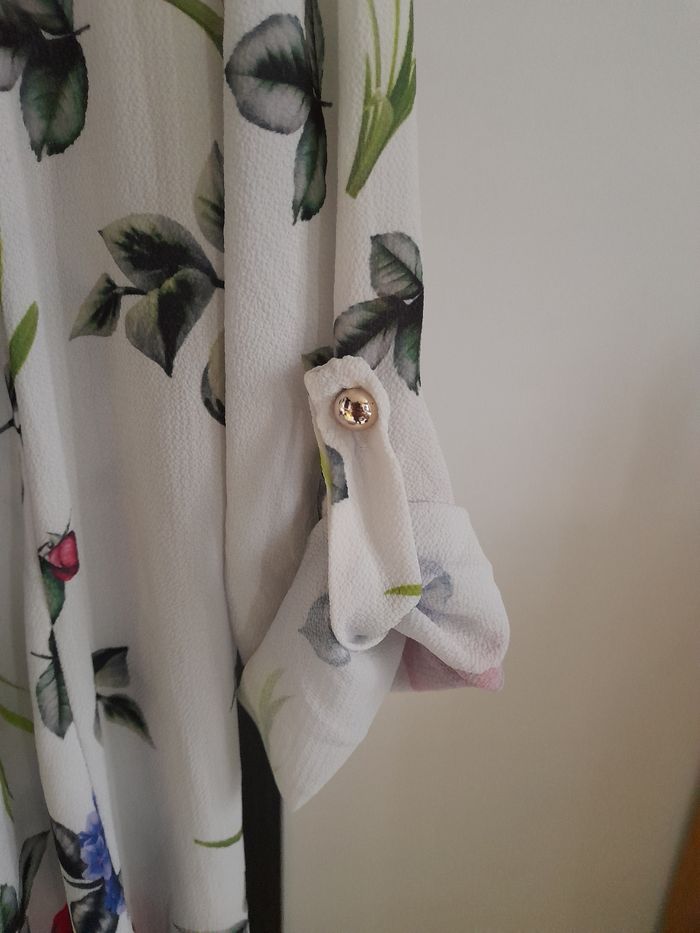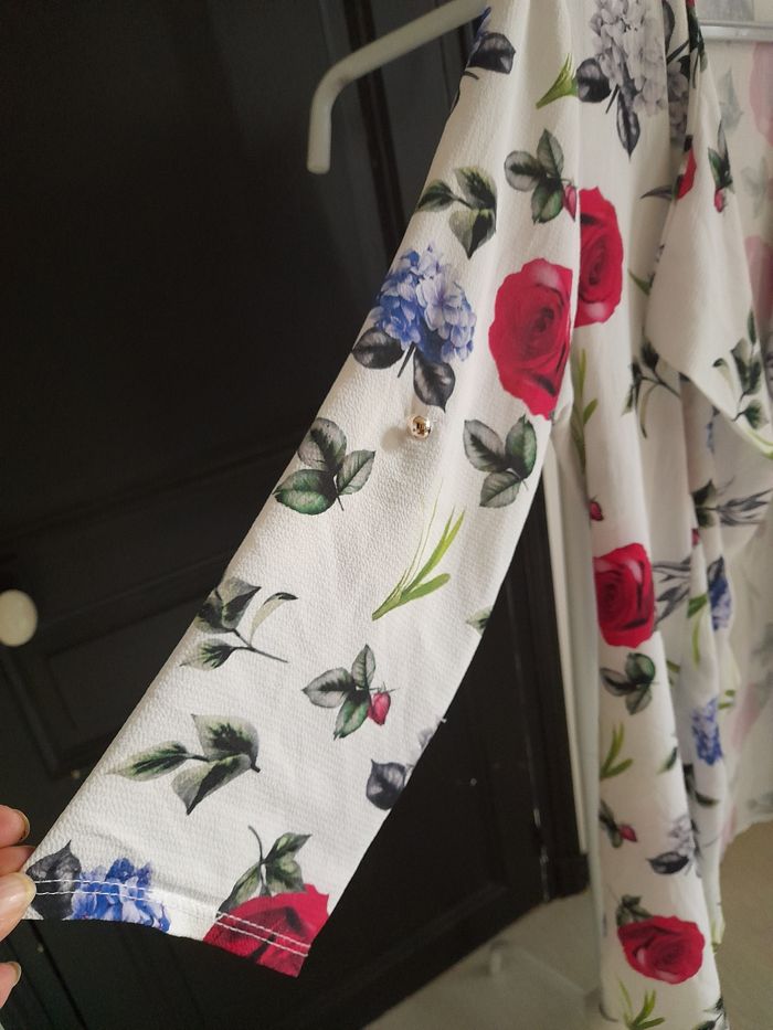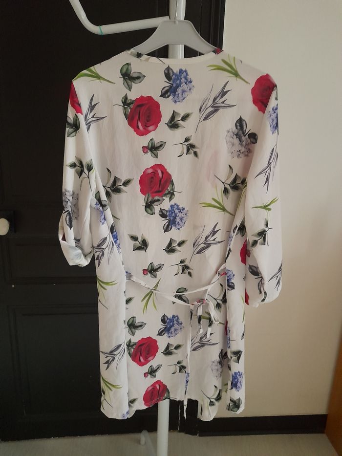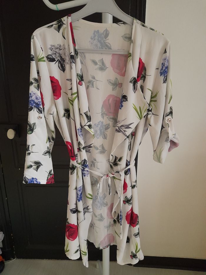 Veste longue taille M Couleur blanc avec motifs fleurs Manches longues ou courtes Attache cordon sur l'arrière ou devant ( voir photo) 95% viscose et 5% Elasthane Très très bon état