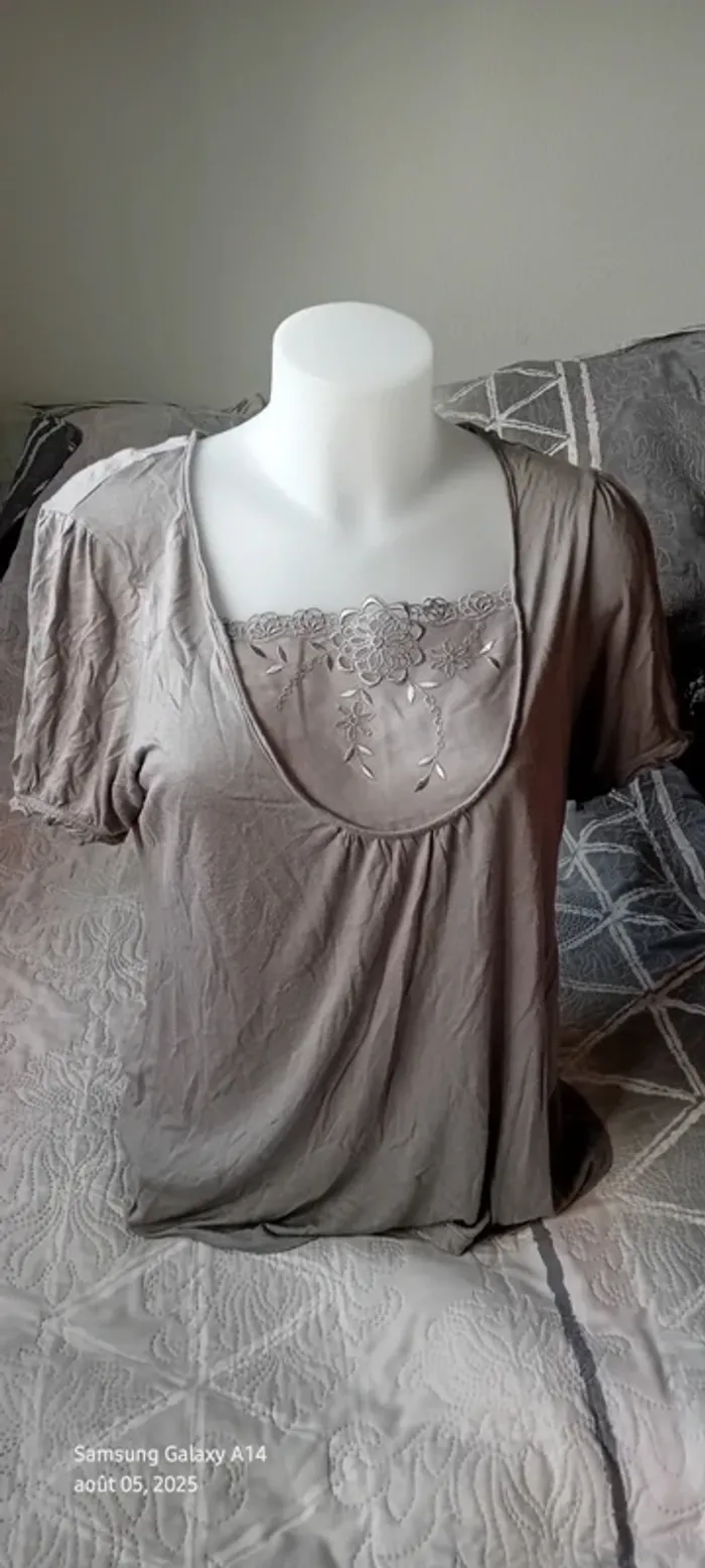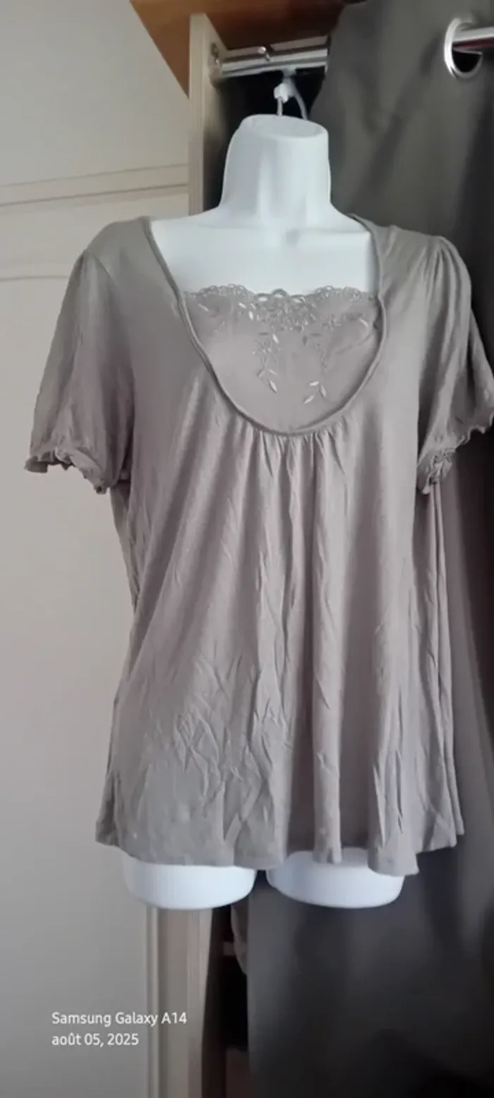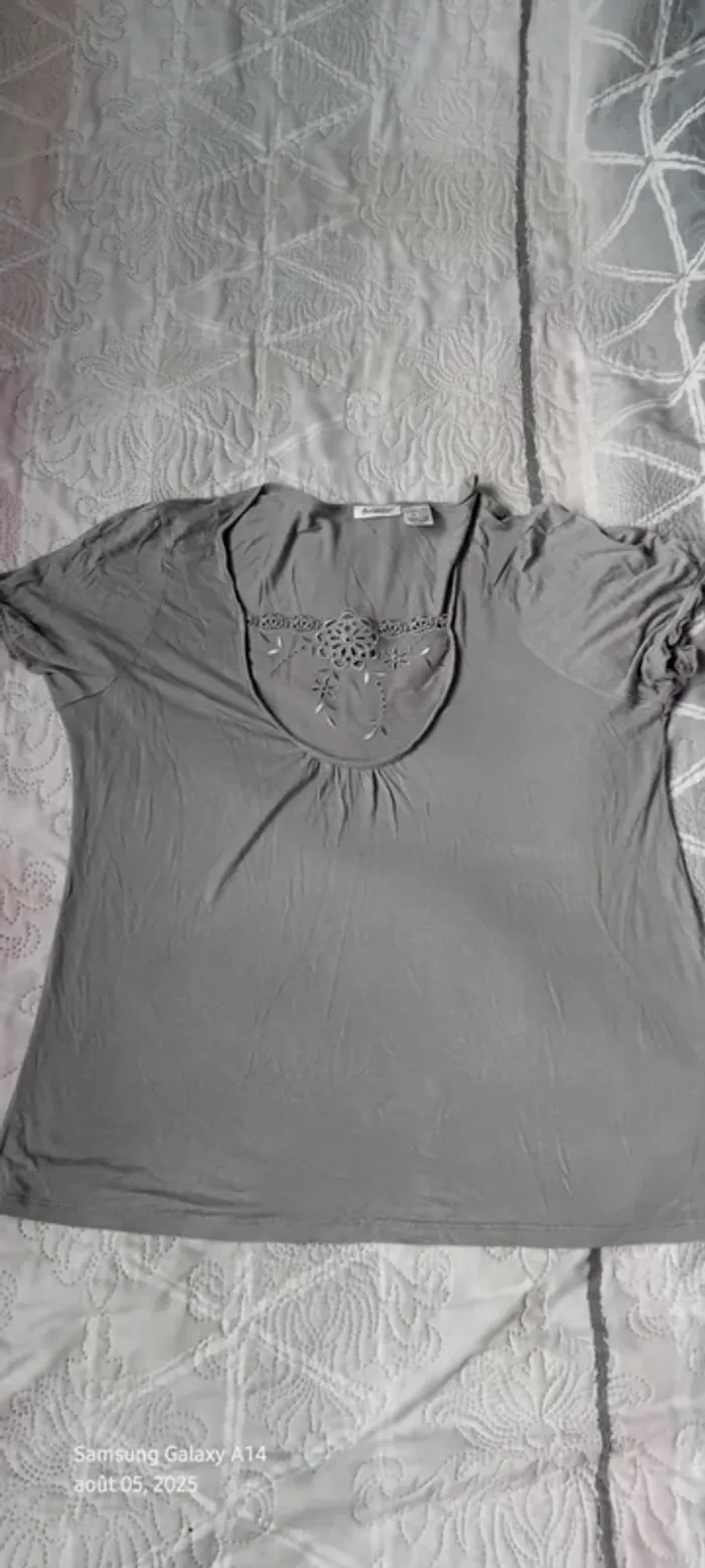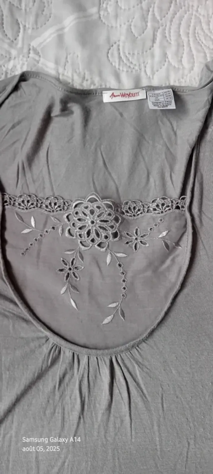 Haut manches courtes élastiques en viscose matière près du corps et extensible décolleté avec broderie ajourée motif floral longueur 64 cm largeur aisselles à aisselles 54 cm largeur épaules 39 cm correspond à un petit 44 portée quelques fois en bon état quelques petites peluches par endroit dues aux lavages (voir dernières photos) Taille Petit #midole #midolefemme #midolefemme44 ##femme44 #femmexxl #hautbroderies #hautviscose #hautgris #hautmanchescourtes #hautanneweyburn #anneweyburn