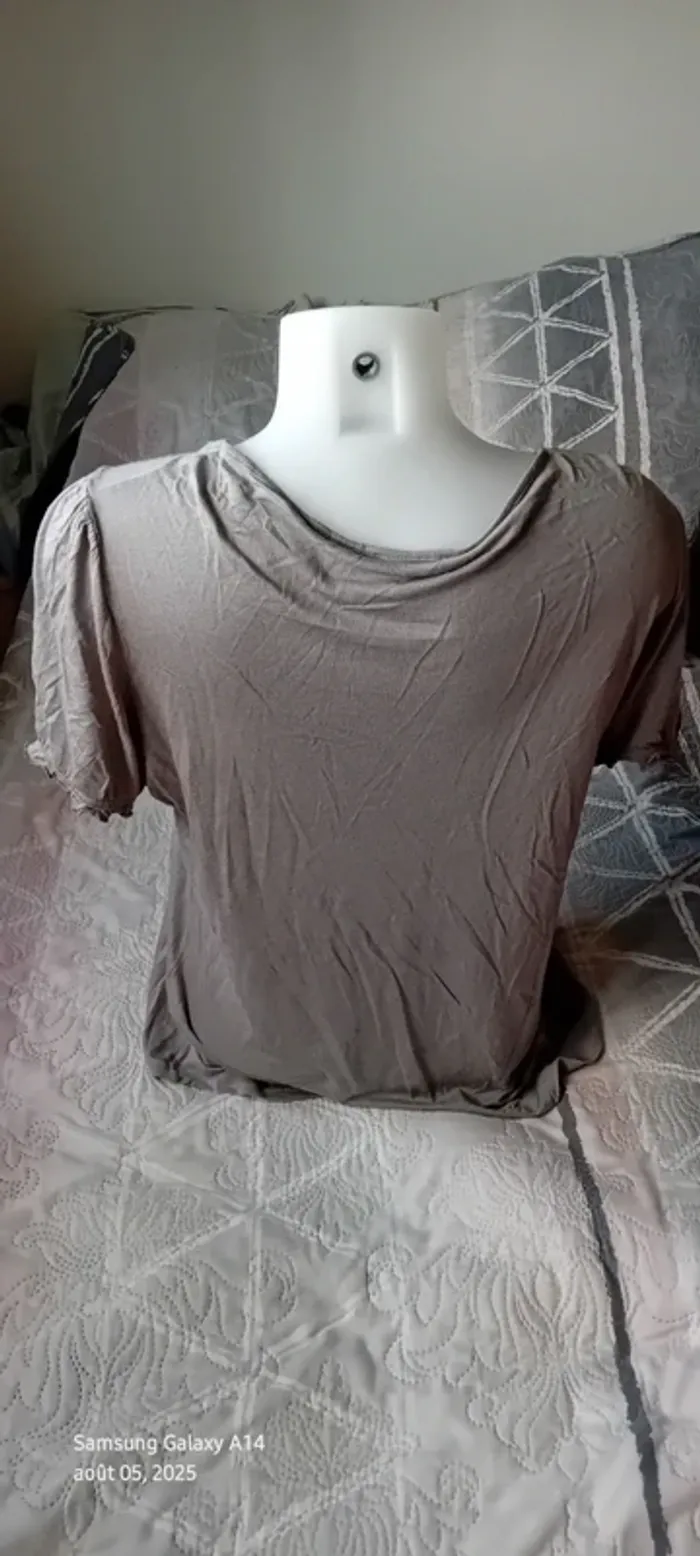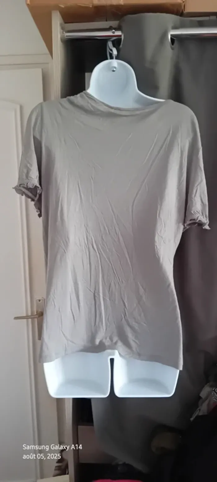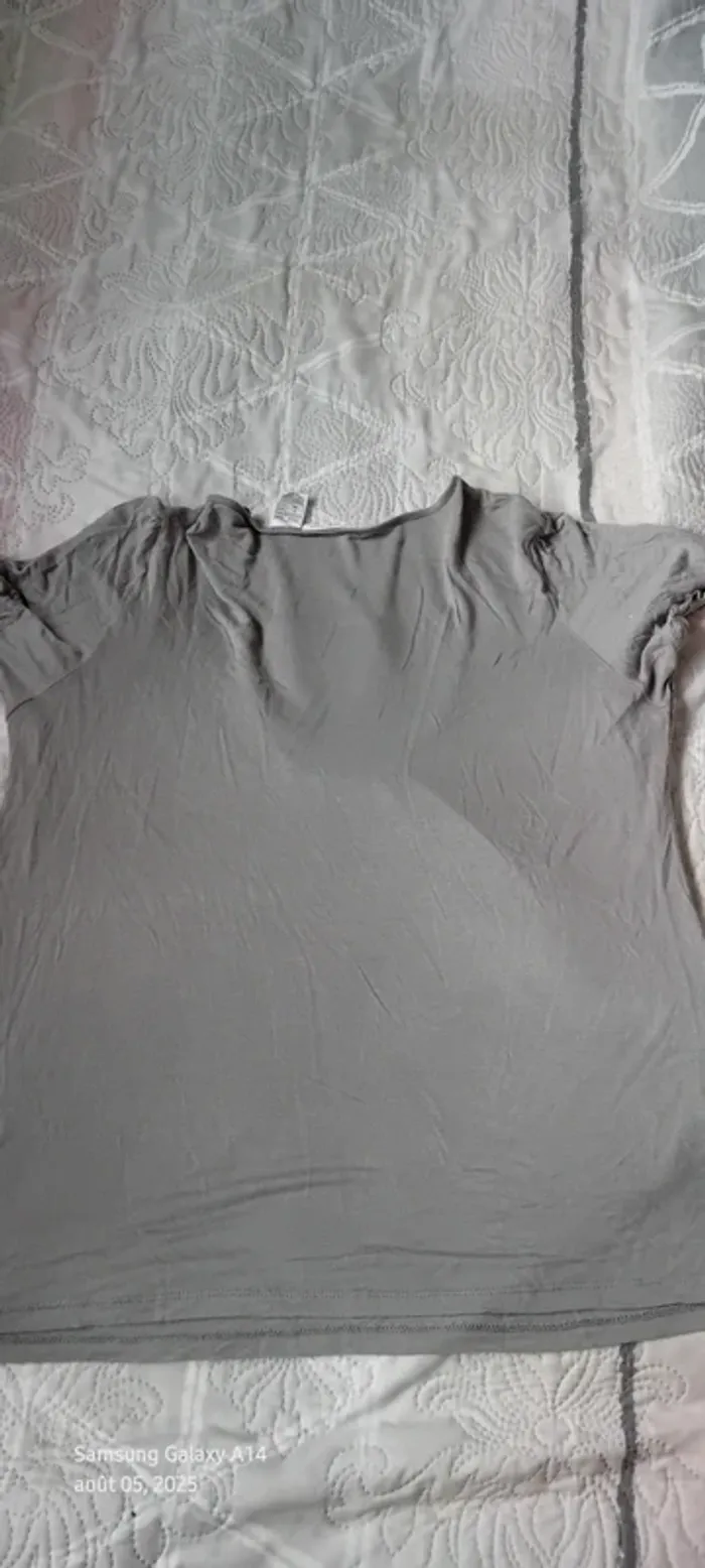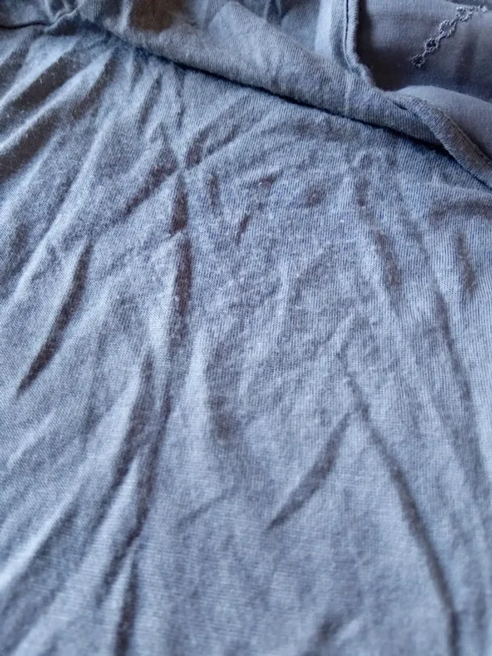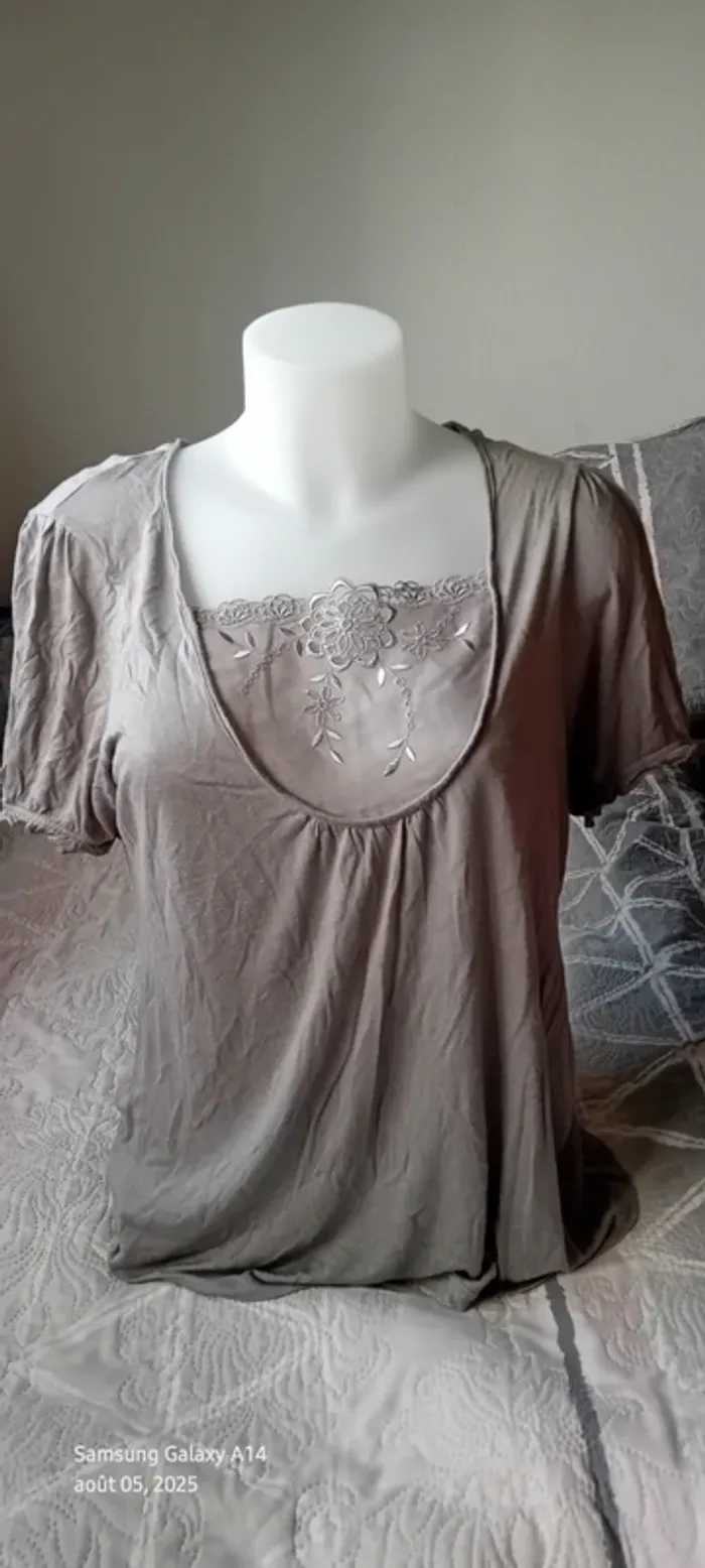Haut manches courtes élastiques en viscose matière près du corps et extensible décolleté avec broderie ajourée motif floral longueur 64 cm largeur aisselles à aisselles 54 cm largeur épaules 39 cm correspond à un petit 44 portée quelques fois en bon état quelques petites peluches par endroit dues aux lavages (voir dernières photos) Taille Petit #midole #midolefemme #midolefemme44 ##femme44 #femmexxl #hautbroderies #hautviscose #hautgris #hautmanchescourtes #hautanneweyburn #anneweyburn