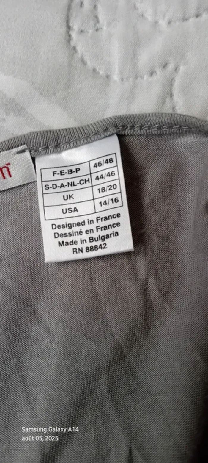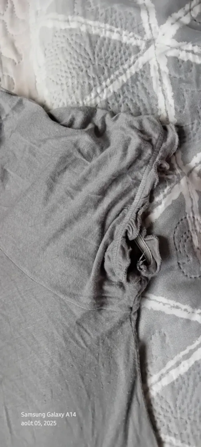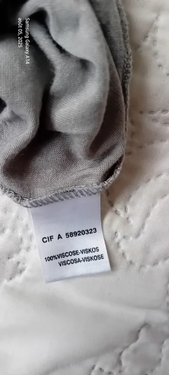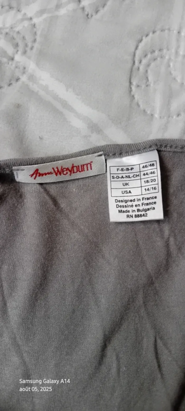 Haut manches courtes élastiques en viscose matière près du corps et extensible décolleté avec broderie ajourée motif floral longueur 64 cm largeur aisselles à aisselles 54 cm largeur épaules 39 cm correspond à un petit 44 portée quelques fois en bon état quelques petites peluches par endroit dues aux lavages (voir dernières photos) Taille Petit #midole #midolefemme #midolefemme44 ##femme44 #femmexxl #hautbroderies #hautviscose #hautgris #hautmanchescourtes #hautanneweyburn #anneweyburn