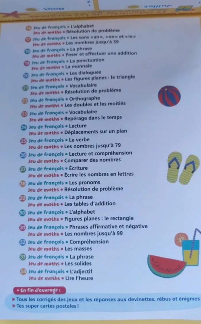 Une feuille a détacher chaque jour Age 6/7 ans Des jeux pour réviser : Le Français Les mathématiques L'anglais Devinettes , rébus et énigmes Découvertes en image Lectures + Corrigés des exercices En bonus 3 cartes postales a envoyer et calendrier de l'été a compléter Éditions Magnard