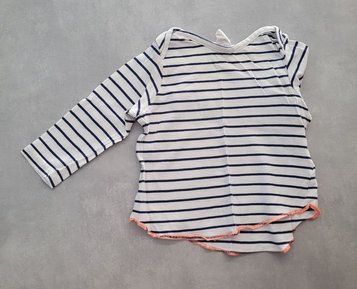T-shirt manches longues, blanc rayé noir, de la marque H&M, taille 4-6 mois (68 cm), en très bon état. Article lavé pour la vente.