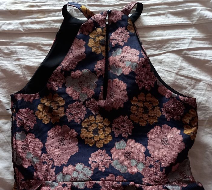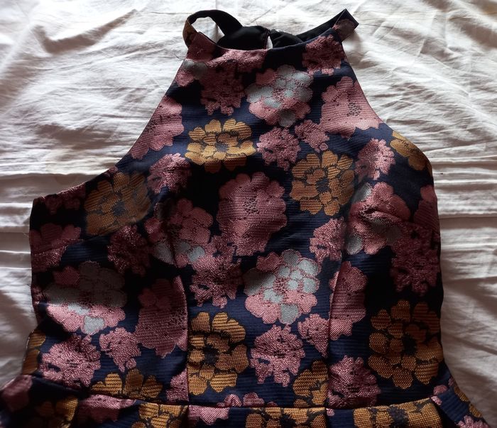 Robe PIMKIE TAILLE 36, tissu un peu épais brillant, taille élastiquée, fermeture éclair côté, bouton derrière le cou (largeur sous aisselles : 41 cm - longueur : 80 cm)