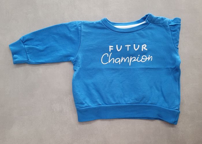 Sweat de couleur bleu, avec inscription "Futur Champion", de la marque U Collection, taille 6 mois, en très bon état. Article lavé pour la vente.