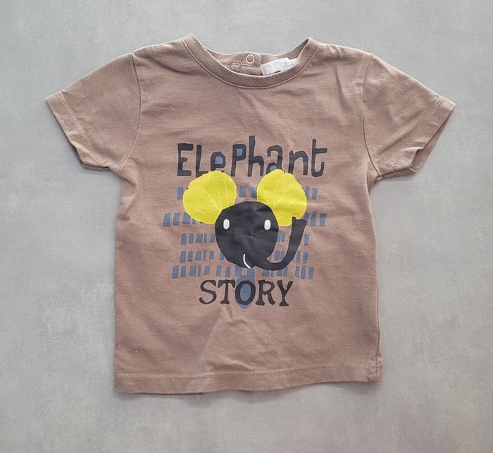 T-shirt manches courtes, de couleur marron avec motif éléphant, de la marque Kitchoun, taille 6 mois (67 cm), en très bon état. Article lavé pour la vente.