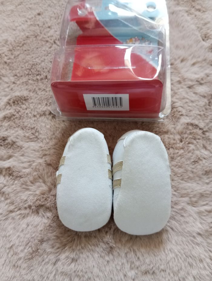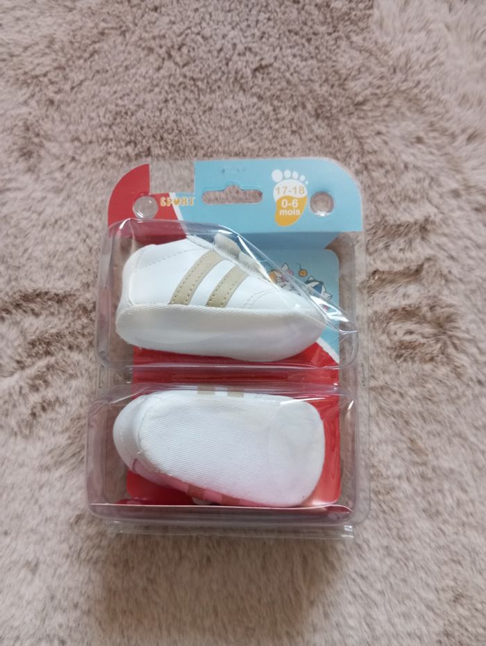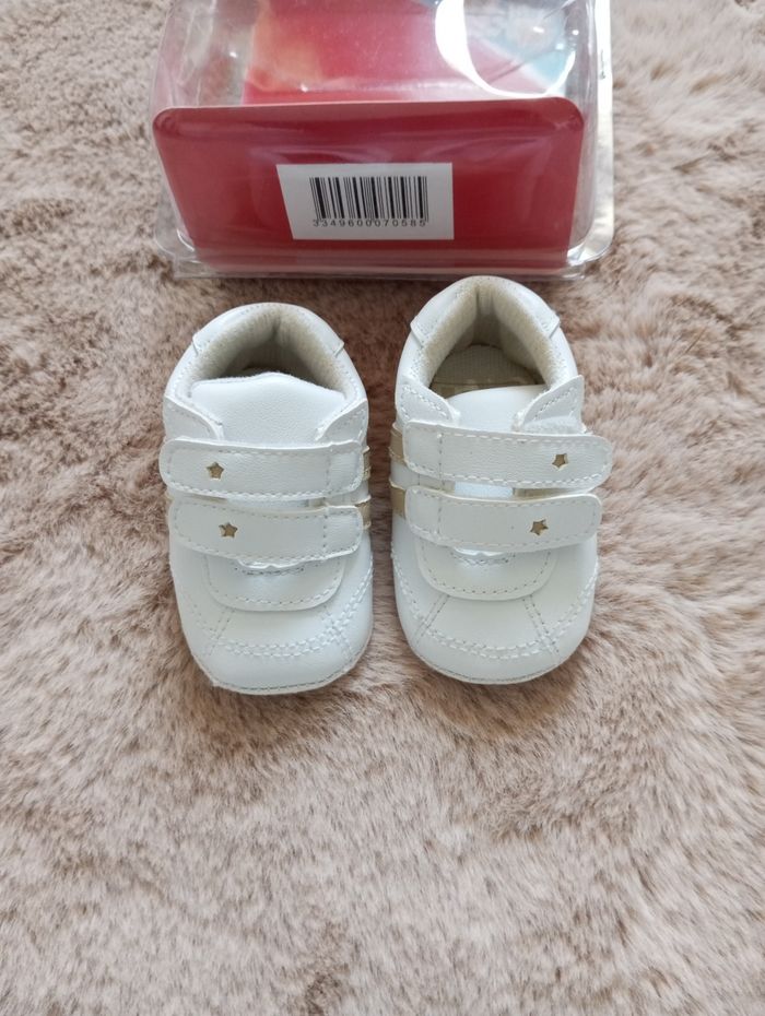 Baskets bébé blanches à scratch, pointure 17-18, 0-6 mois. Portées une seule fois.