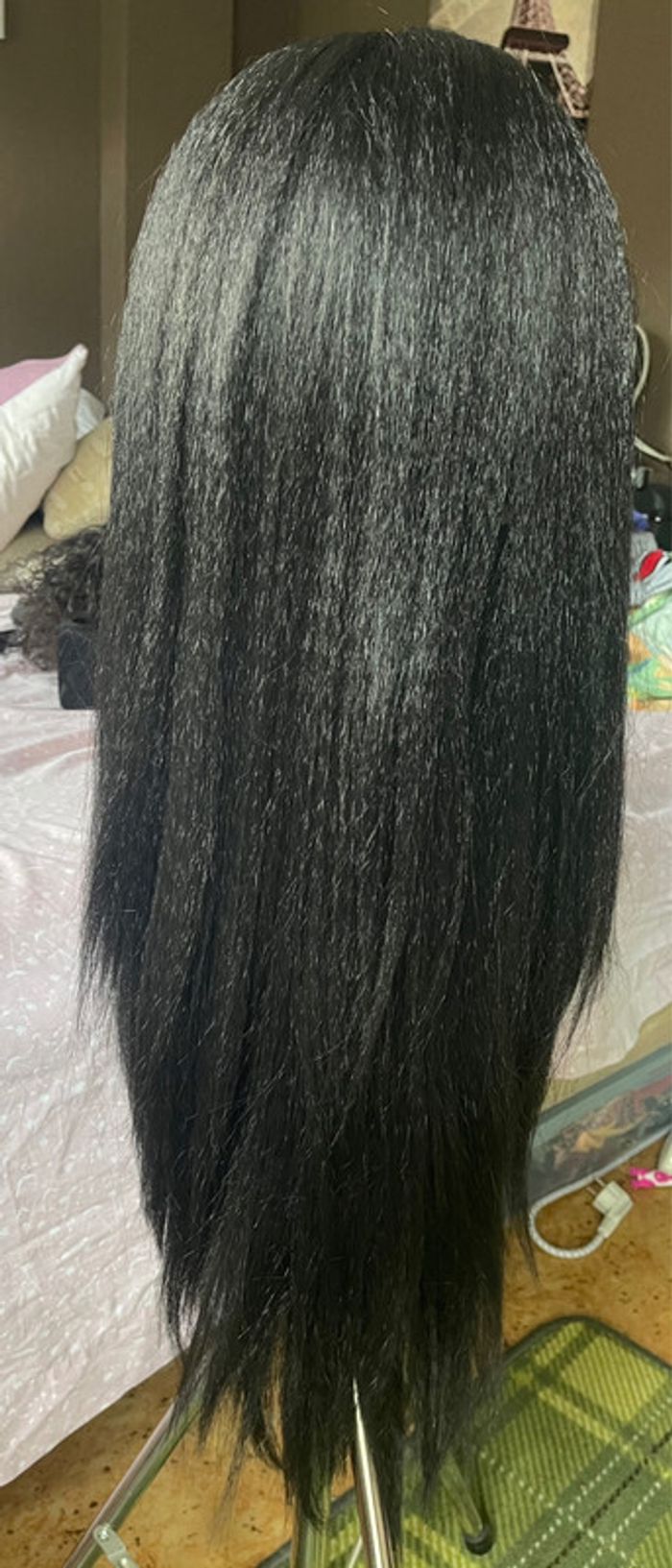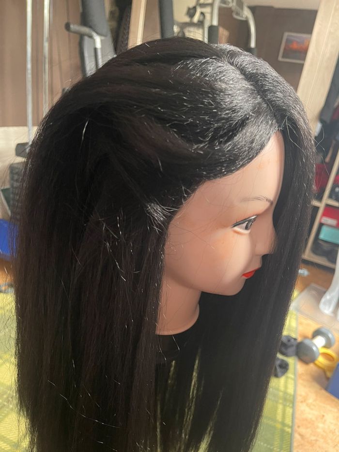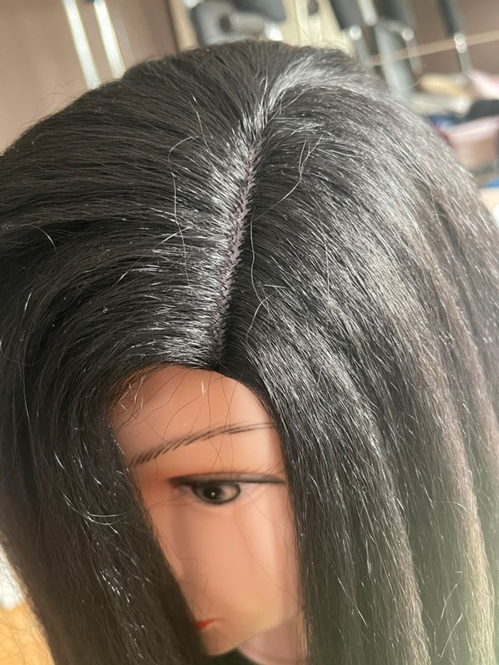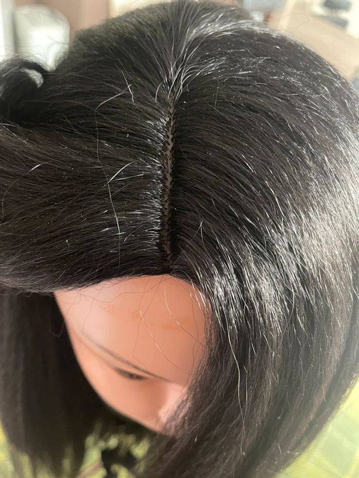 Très jolie avec au milieu faux cuir chevelu très réaliste pour personne noire vous pouvez mettre votre fond de teint dessus pour éclaircir c’est comme vous le souhaitez sinon vous pouvez boucler les cheveux, les cheveux sont doux facile à coiffer vous pouvez faire plusieurs styles de coiffures comme je l’ai fait sur les photos elle est très longue
