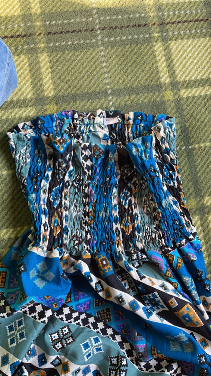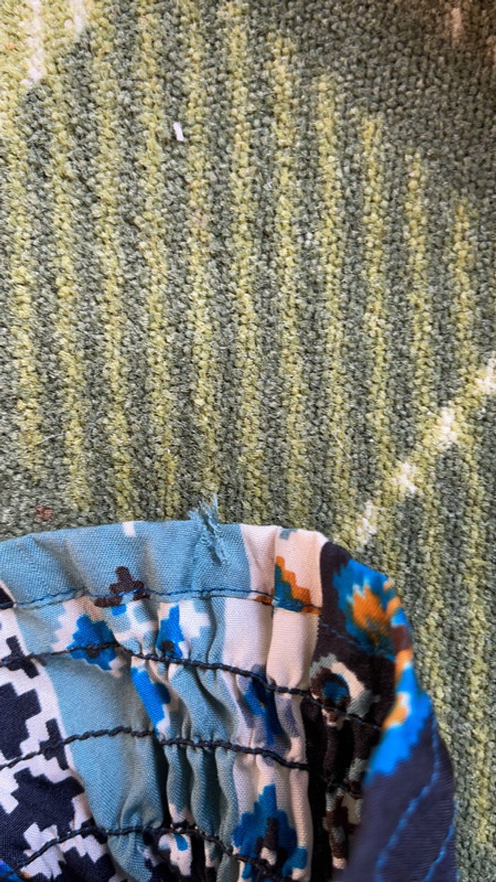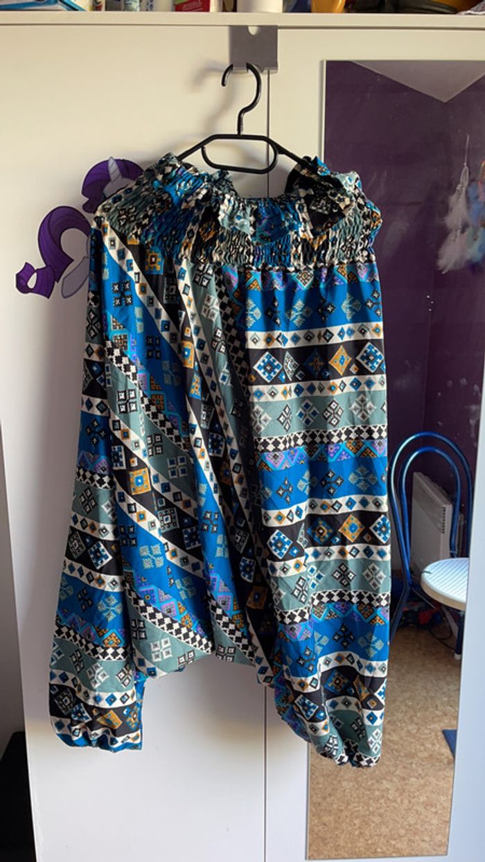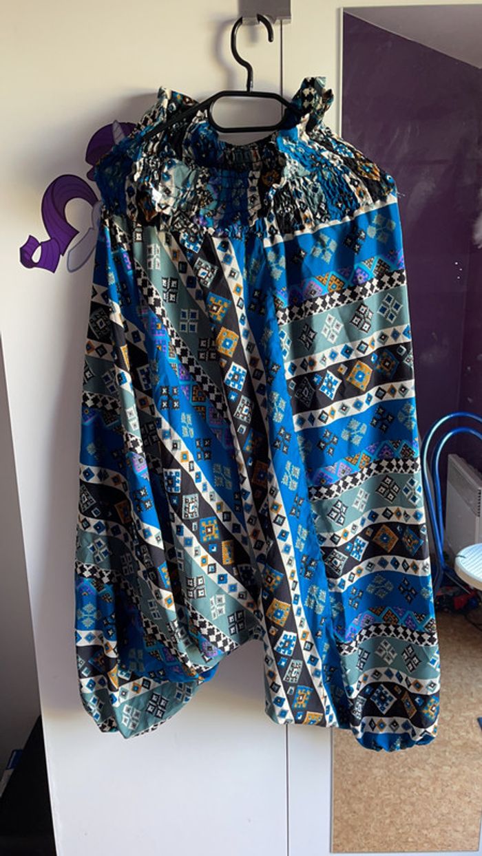 forme sarouel tissu léger comment dire, elle peut être portée par une personne faisant du 36 autant elle peut aller à une personne qui met du 42, le haut est très élastique pour une personne qui met du 36 faut avoir une belle poitrine pour qu’elle tienne moi par exemple je mets du 36 ça a tendance à tomber petite déchirure voir la dernière photo rien de méchant
