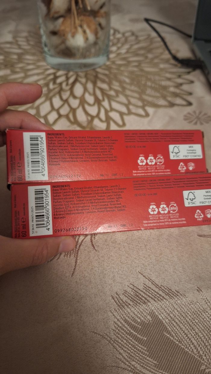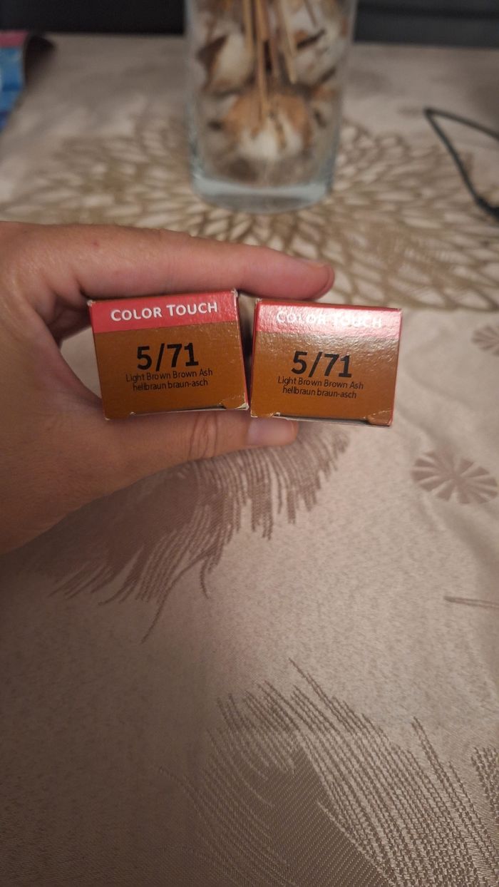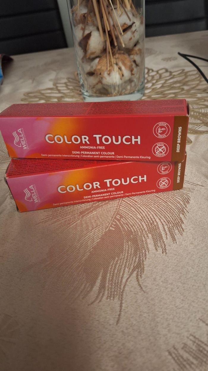 Bonjour Je vends ce lot de 2 teintures neuves ⚠️Vendu sans l'oxydant ✴️Forme de l'article Crème ✴️Type de cheveux :Normal ✴️2 tubes ✴️De la marque Wella professionnals ✴️Gamme Color Touch ✴️Sans ammoniaque ✴️Coloration semi-permanente ✴️Teinte brillante à la cire d'abeille n°5/71 ✴️Coloration de 60 ml pour chaque tube ✴️Peut être mélangée entre elles ✴️Dure jusqu'à 24 lavages