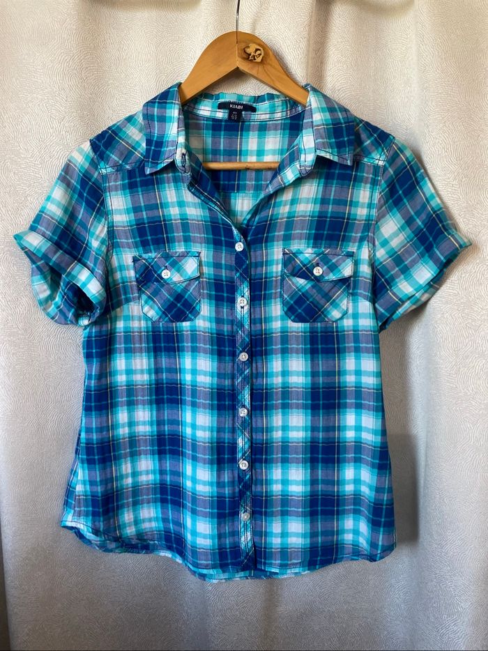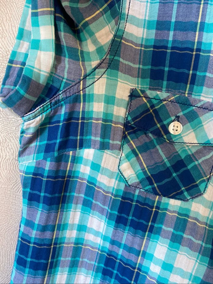 Chemisier Liquette écossais carreaux madras blanc turquoise bleu marine Manches courtes avec revers Pinces poitrine Poches poitrine avec rabats boutonnés Taille 40 100% coton je pense, étiquette coupée Carrure 39 cm Aisselle à aisselle 51,5 cm Longueur 62 kiabi Western country