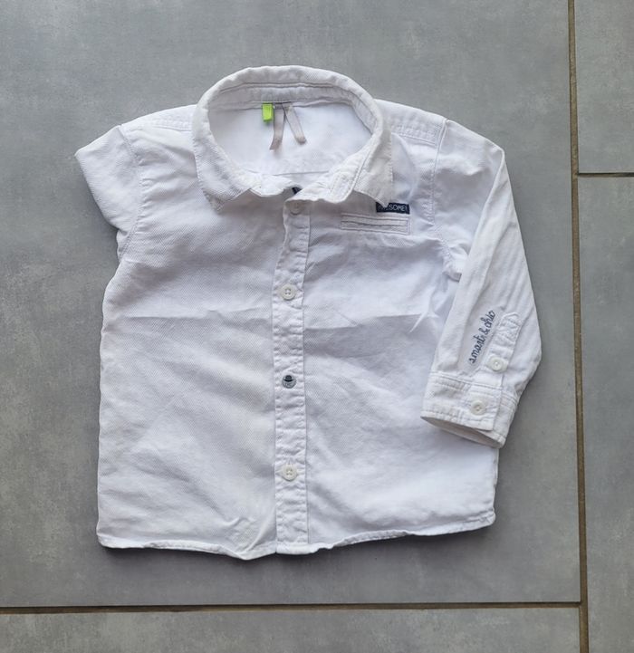 Chemise manches longues, de couleur blanche, très élégante avec inscription sur le cœur et au niveau d'un poignet, de la marque Orchestra, taille 9 mois (71 cm), en très bon état. Article lavé pour la vente.