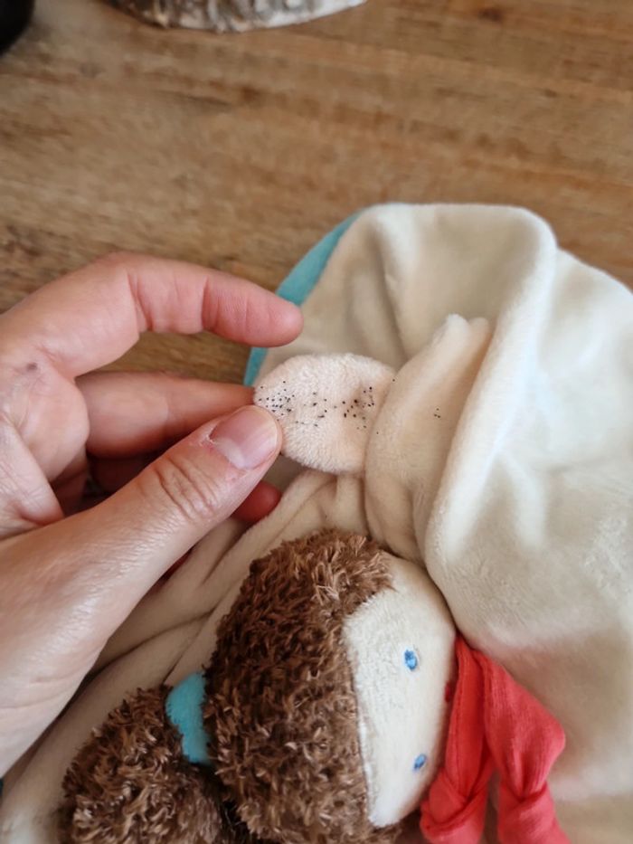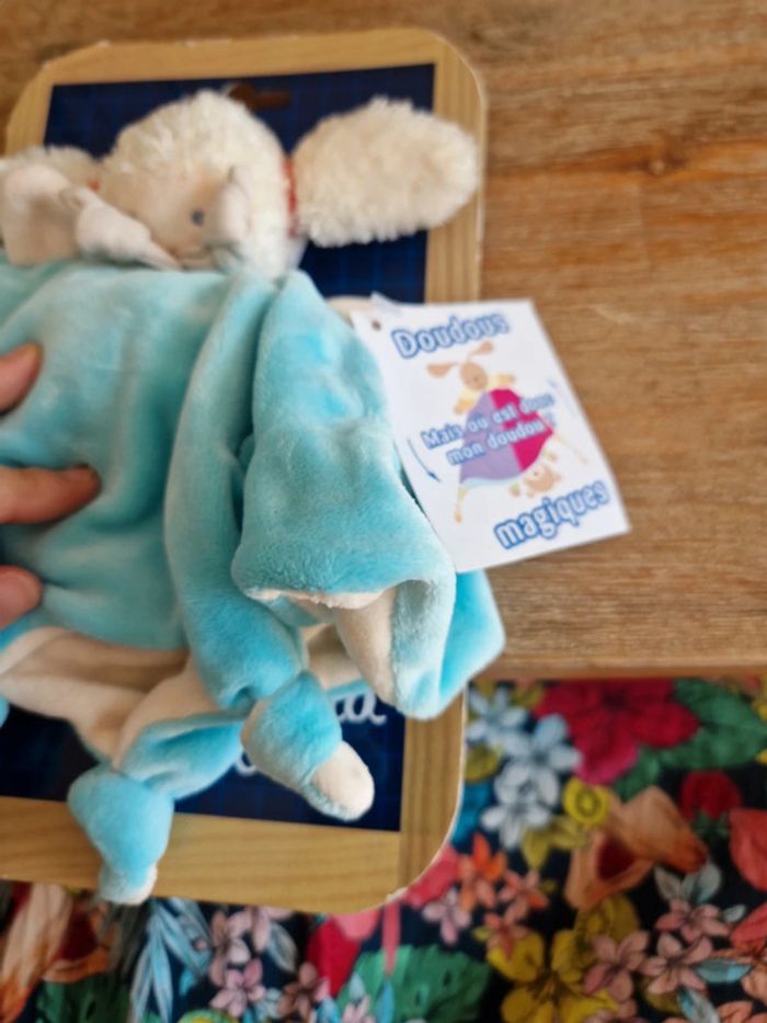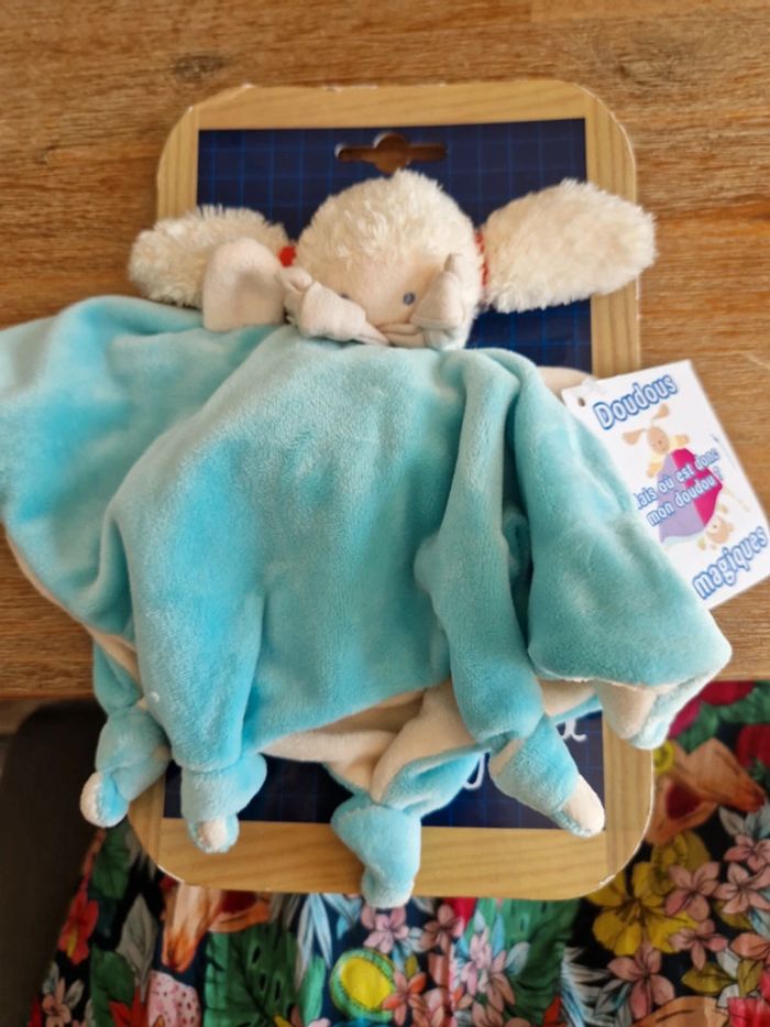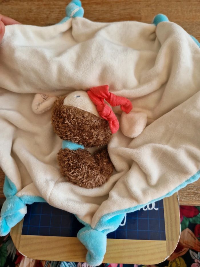 Doudou plat Marque ajena Réversible Poupée Bleu et beige Avec carton et étiquette Il a une tâche sur l'oreille mais elle s'enlève avec l'ongle donc dans la machine elle s'enlevera sans problème #ajena #doudou #doudouajena #doudouplat #doudoureversible