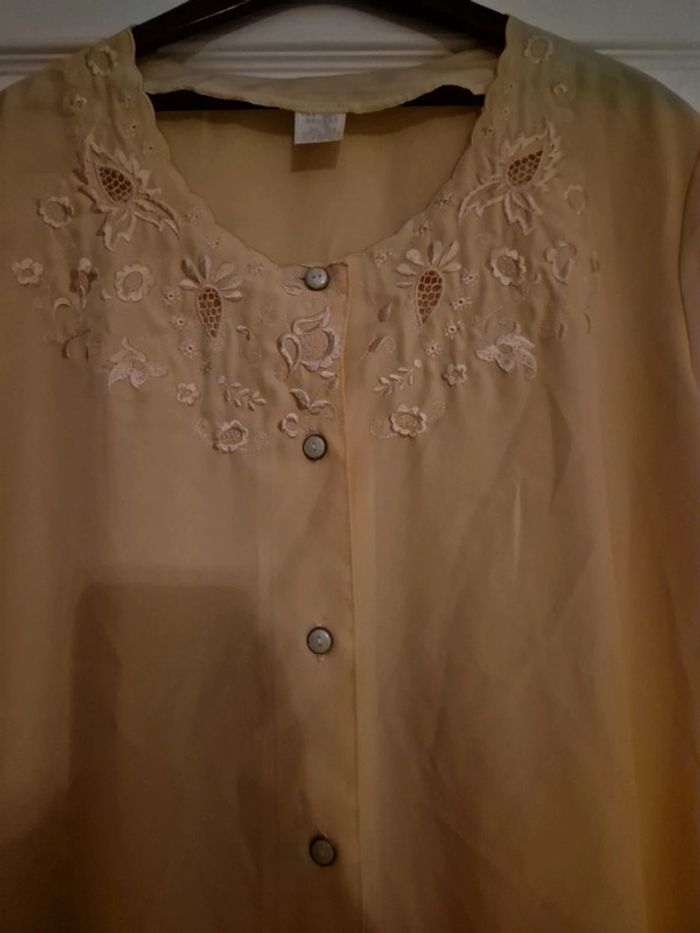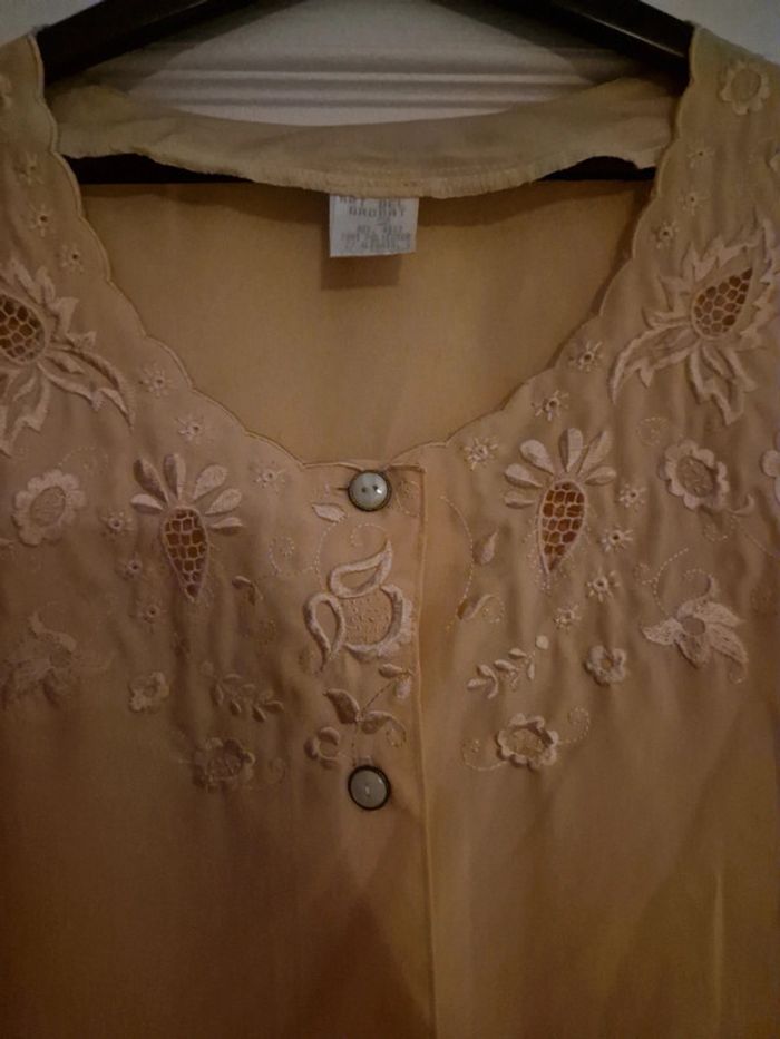 Superbe blouse chemisier vintage Avec broderies sur le décolleté (léger fils tirés qui ne se voient pas) Taille 2 soit m Mais il est très oversize Couleur rose pâle saumon Superbe noué à la taille par exemple ou sur un jeans mom #vintage #retro #chemisier #blouse #broderie #pinup