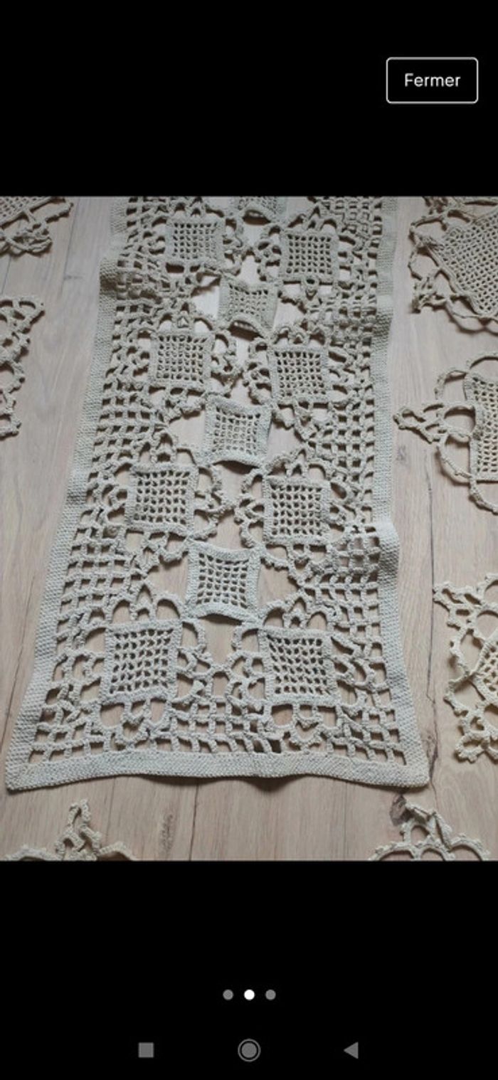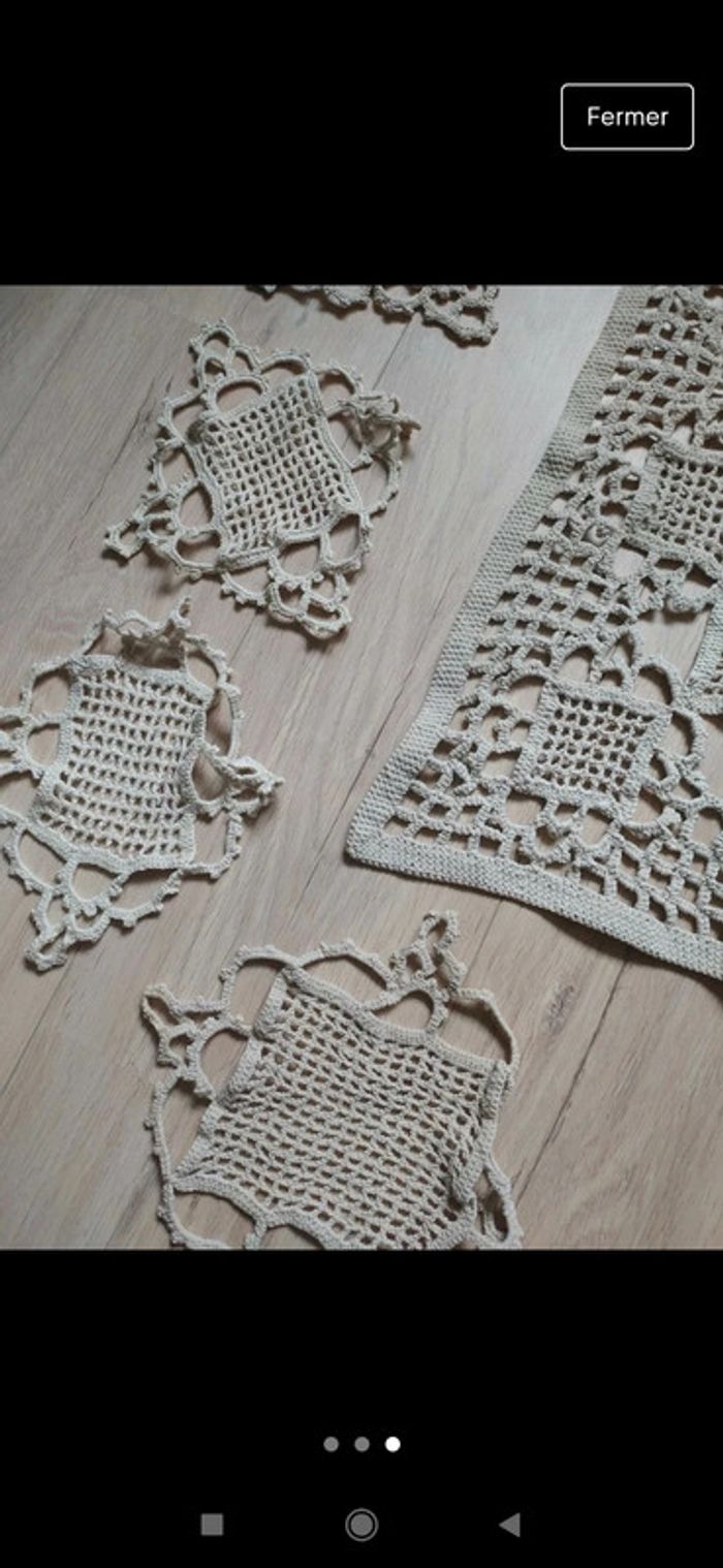 Superbe chemin de table vintage en crochet Fait à la main Date des années 50 Accompagné de ces sous verres Certains ont de minuscules tâches mais cela âne se voit pas du tout. #decovintage #deco #vintage #artdelatablevintage #artdelatable #crochet #setdetable #chemindetable