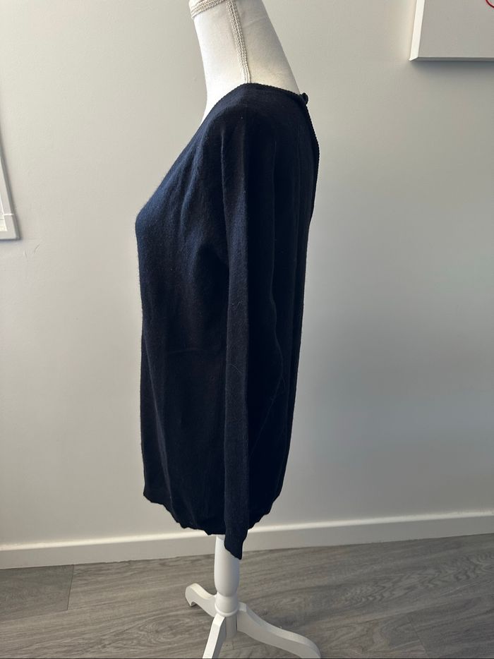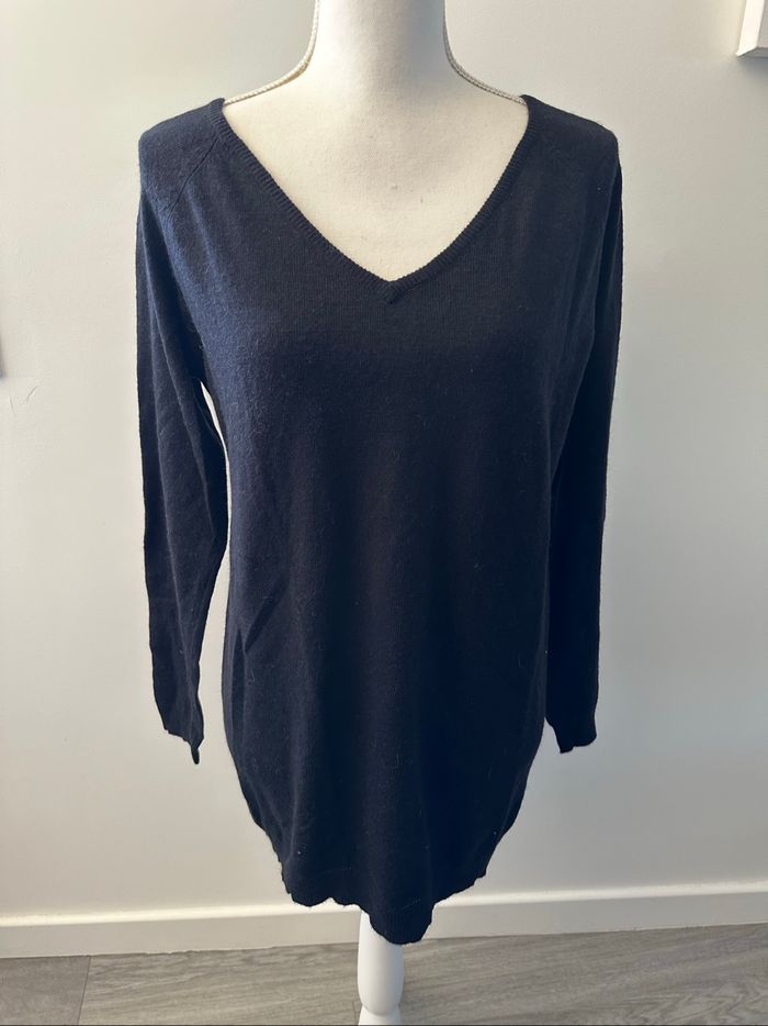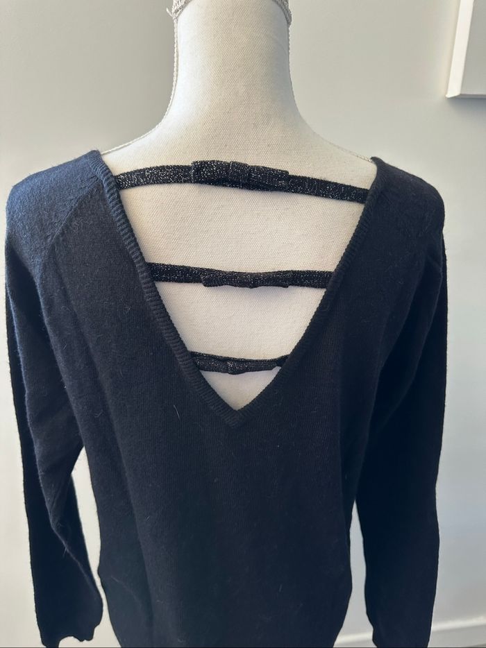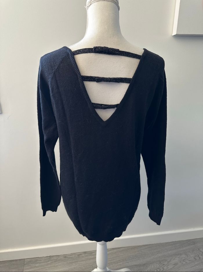 Pull long - Excellent état - Taille 40 équivalent L Dimensions en bas de l’annonce - Flot noeud et liens dans le dos - Col en V - Noir et argenté - Marque Sud Express - Polyamide, acrylique et angora Dimensions: - 50 à 60cm niveau aisselles - 75cm de long