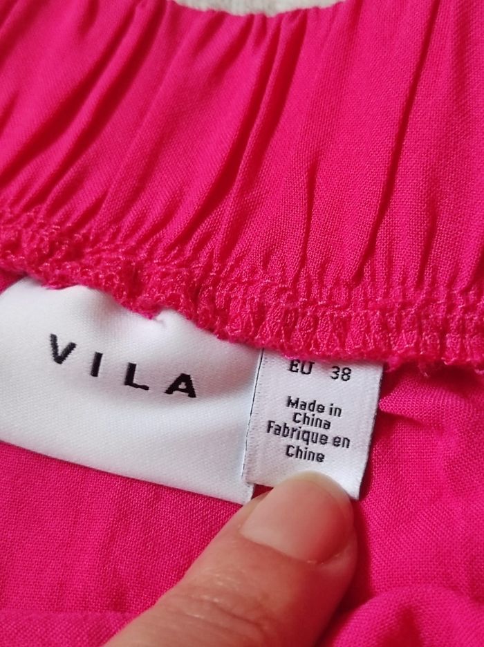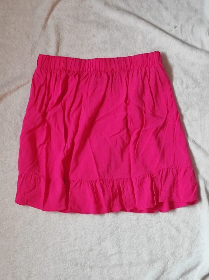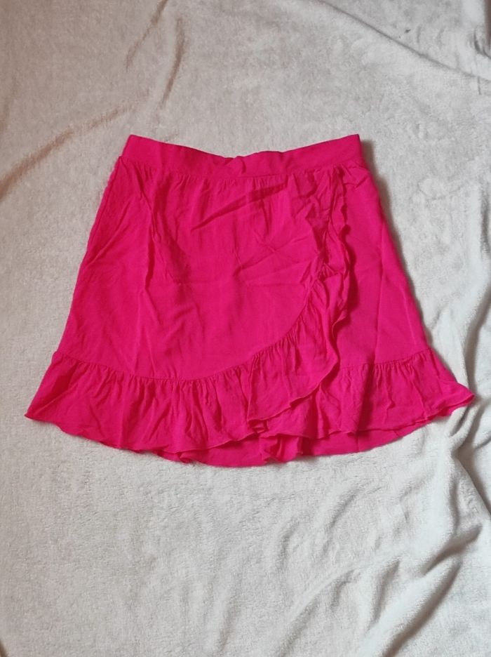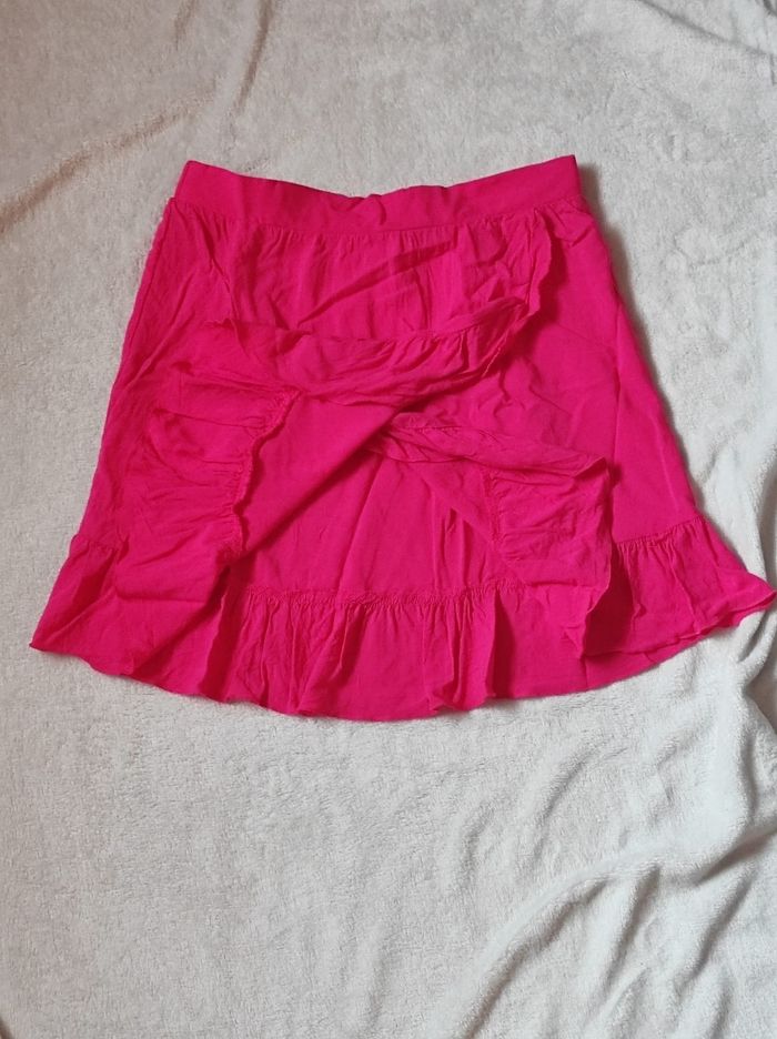 mini jupe courte en portefeuille d'un rose fushia, taille élastique. Jupe légère et agréable à porter. Marque vila en taille 38 / M. 100% viscose