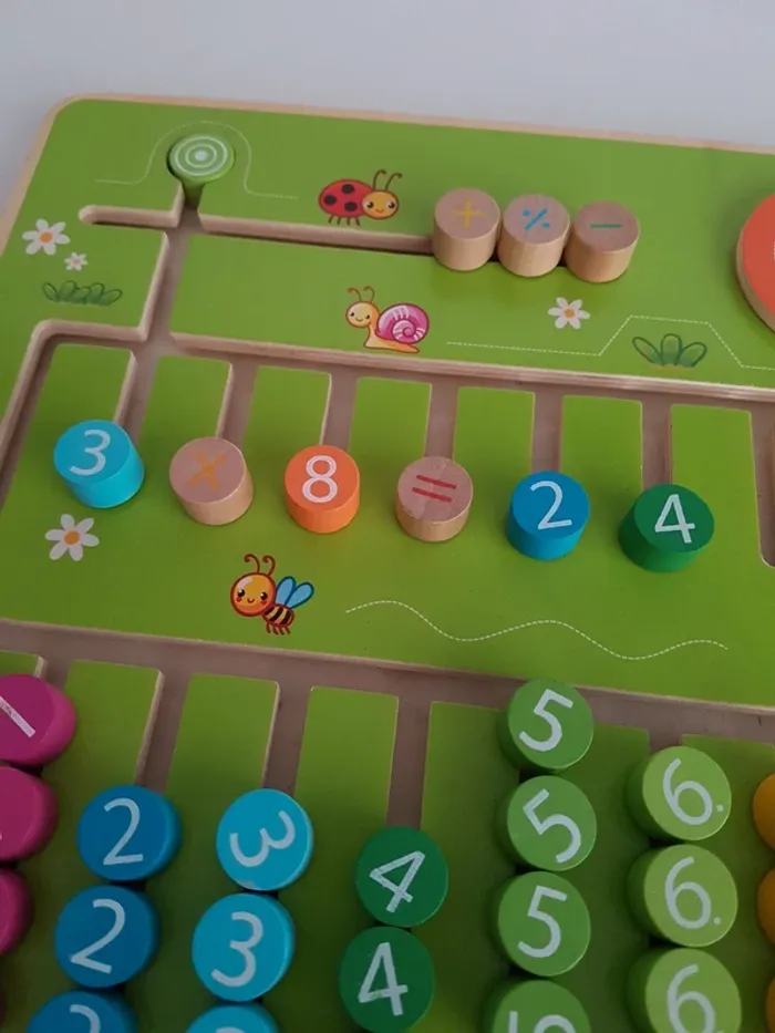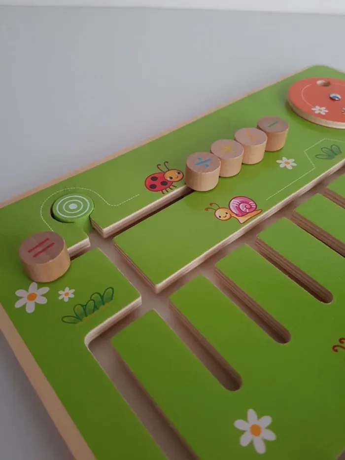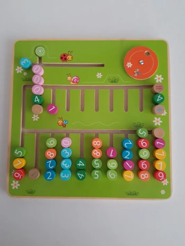 Le labyrinthe des perles arc-en-ciel est un jeu de calcul en bois qui encourage la manipulation et la reconnaissance des nombres pour effectuer les premiers calculs mathématiques. Le tableau présente les chiffres dans chaque colonne organisés de 0 à 9 et une ligne pour effectuer les opérations avec 5 signes mathématiques (pour multiplication, addition, division, soustraction) La roue permet de compter de 10 en 10 Un outil pédagogique montessori pour travailler la notion d'ordre des nombres, développer la motricité fine, l'observation, le tri et le calcul mathématique de manière tactile. COMPLET : 1 plateau avec des chiffres inamovibles. Dimensions de la tablette : 29 × 29 cm