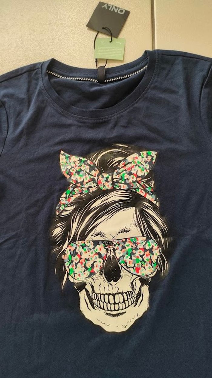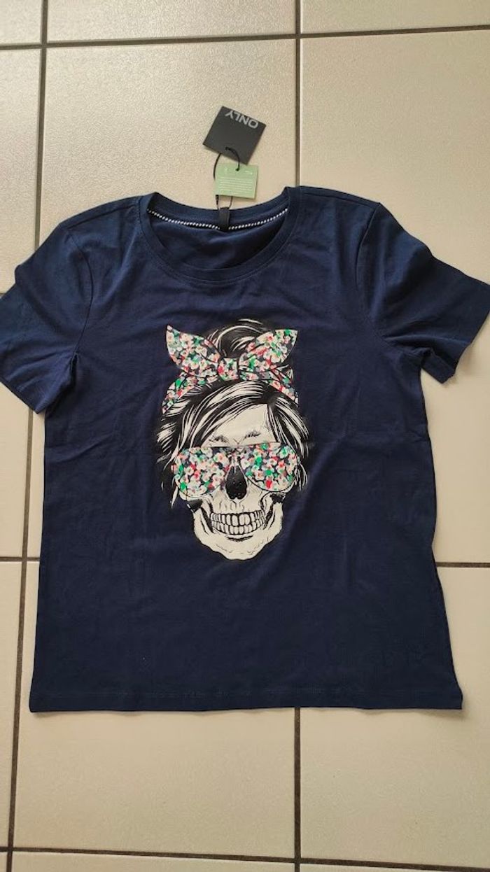 tee shirt bleu "tête de mort" ONLY taille 36 NEUF - photo numéro 1