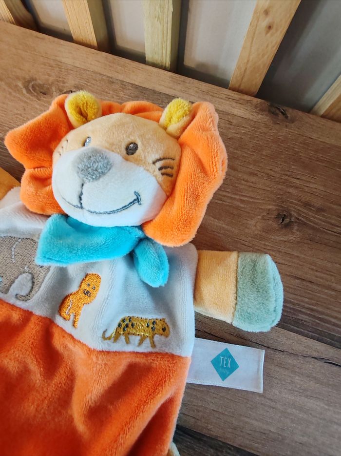Tex collection Jungle doudou plat lion orange jaune bleu vert éléphant Tbe Étiquette marque présente 14.90 euros Envoi en relais