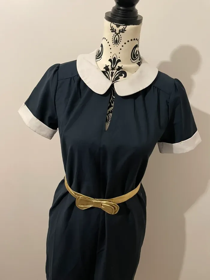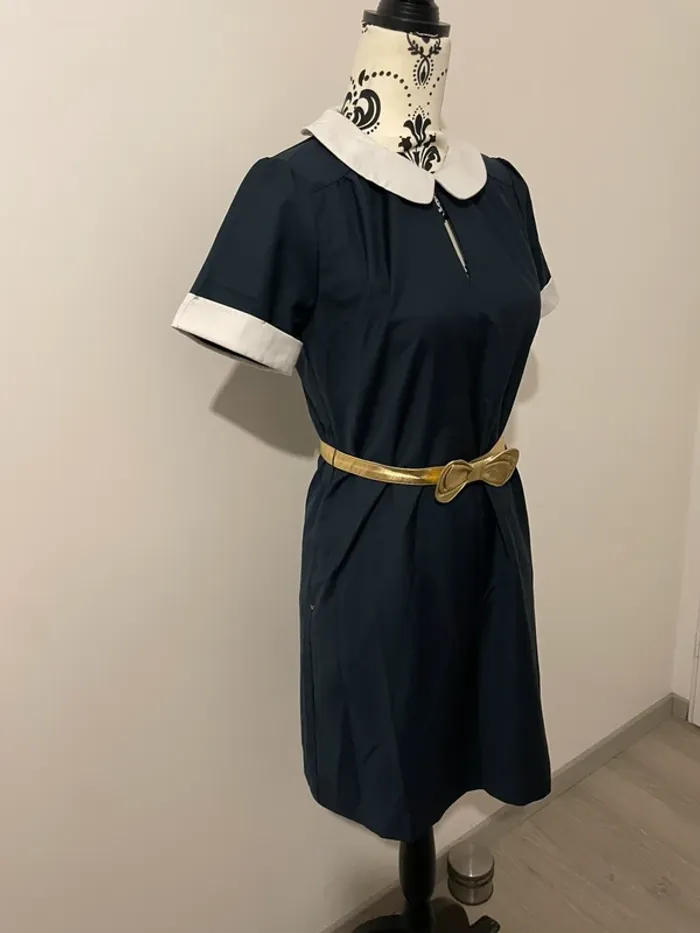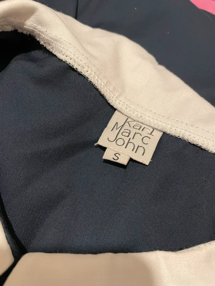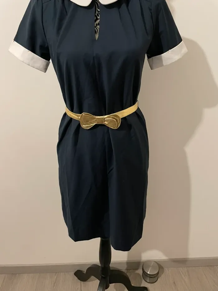 Robe élégante de la marque Karl Marc John, taille S. Coupe droite et féminine, idéale pour le bureau, une sortie ou un événement. 💙 Couleur : bleu marine avec col Claudine et revers de manches blancs 💛 Ceinture dorée amovible incluse (style noeud) 👗 Fermeture discrète au dos 📌 Tissu fluide et léger, agréable à porter 📏 Conseillée pour un 36 – petit 38 💬 État : excellent état, portée une seule fois, aucun défaut 📦 Envoi rapide et soigné 📸 Plus de photos dispo sur demande 💌 N’hésite pas si tu as des questions !