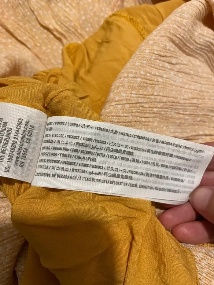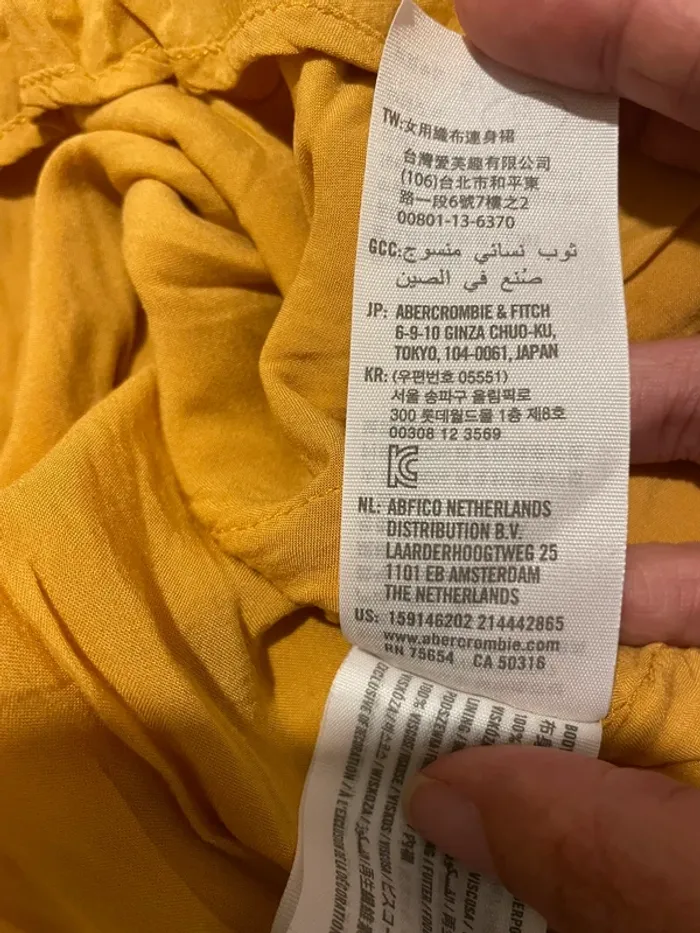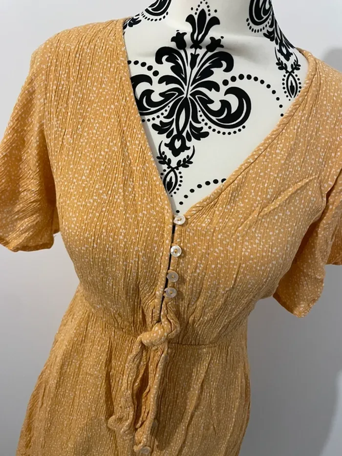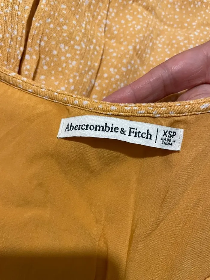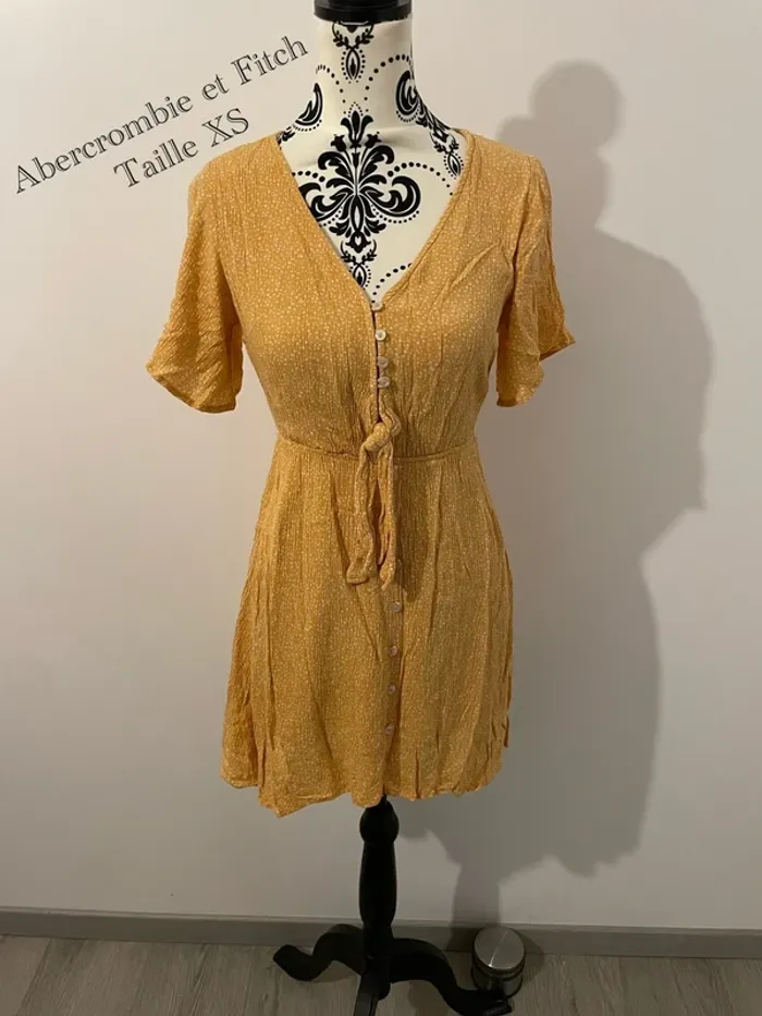 Jolie robe fluide de la marque Abercrombie & Fitch, couleur jaune moutarde avec motifs blanc, idéale pour le printemps ou l’été ☀️ Coupe cintrée, manches courtes, ceinture élastique, col V, noeud devant Taille XS – convient à un 34 ✔️ Très bon état, très peu porté ✔️ Confortable et facile à porter ✔️ Tissu léger et agréable 📦 Envoi rapide et soigné 💬 N’hésite pas si tu as des questions ! 🛍️ Possibilité de faire un lot