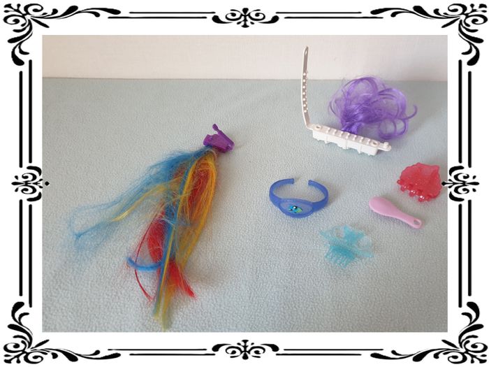 Lot accessoires cheveux et bracelet. Lot de barrettes à cheveux pour poupées composé de : - 1 barrette de 3,5 cm de longueur avec cheveux multicolores de 1 cm de longueur - 1 barrette de 10 cm de long avec cheveux violets de 11 cm de longueur - 1 barrette peigne de 2,5 de long + 2,5 cm de couronne - 1 pince à cheveux ou à papier de 4 cm de longueur - 1 brosse de 5,5 cm de longueur - 1 bracelet enfant de 6 cm de diamètre En bon état. 1,00€ le lot. #vero38110poupees