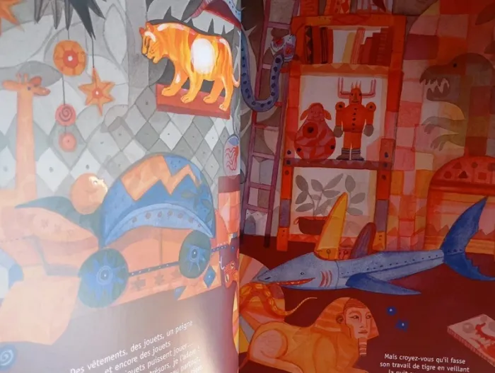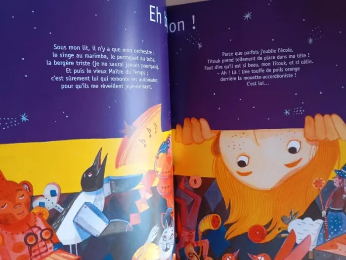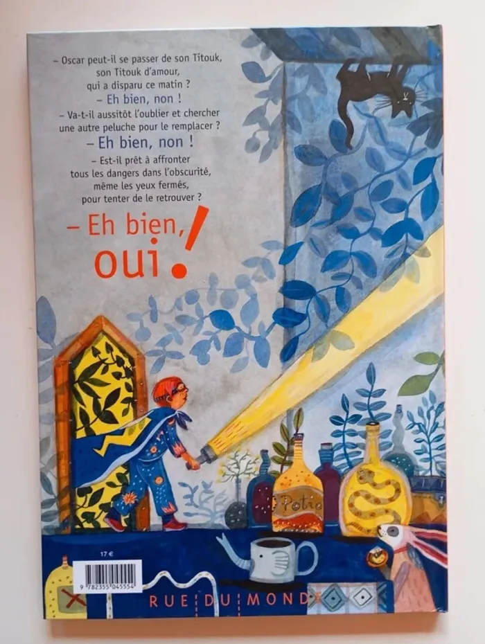 – Oscar peut-il se passer de son Titouk, son Titouk d'amour, qui a disparu ce matin ? – Eh bien, non ! – Va-t-il aussitôt l'oublier et chercher une autre peluche pour le remplacer ? – Eh bien, non ! – Est-il prêt à affronter tous les dangers dans l'obscurité, même les yeux fermés, pour tenter de le retrouver ? – Eh bien, oui ! Commentaire : Alain Serres nous entraîne dans une aventure pleine de péripéties et d'imagination avec des escaliers, de l'obscurité, des formules magiques, des engrenages, des codes secrets... Les illustrations d'Anna Griot elles sont colorées, créatives et poétiques. Foisonnantes, elles offrent plein de détails à observer. Elles enrichissent à merveille le texte inventif et rythmé de l'auteur. Et la fin en forme de gros câlin fait de cet album une belle aventure de lecture pleine d'émotions et de plaisir. Album très grand format, couverture rigide Éditeur ‏ : ‎ Rue du monde 36 pages Âge de lecture ‏ : ‎ 3 - 6 ans Dimensions ‏ : ‎ 23.6 x 0.8 x 33.8 cm Prix éditeur : 17€ Livre NEUF Je vends d'autres livres de la même collection #phil_peg_ruedumonde ou d'Alain Serres #phil_peg_alainserres #doudou #alainserres