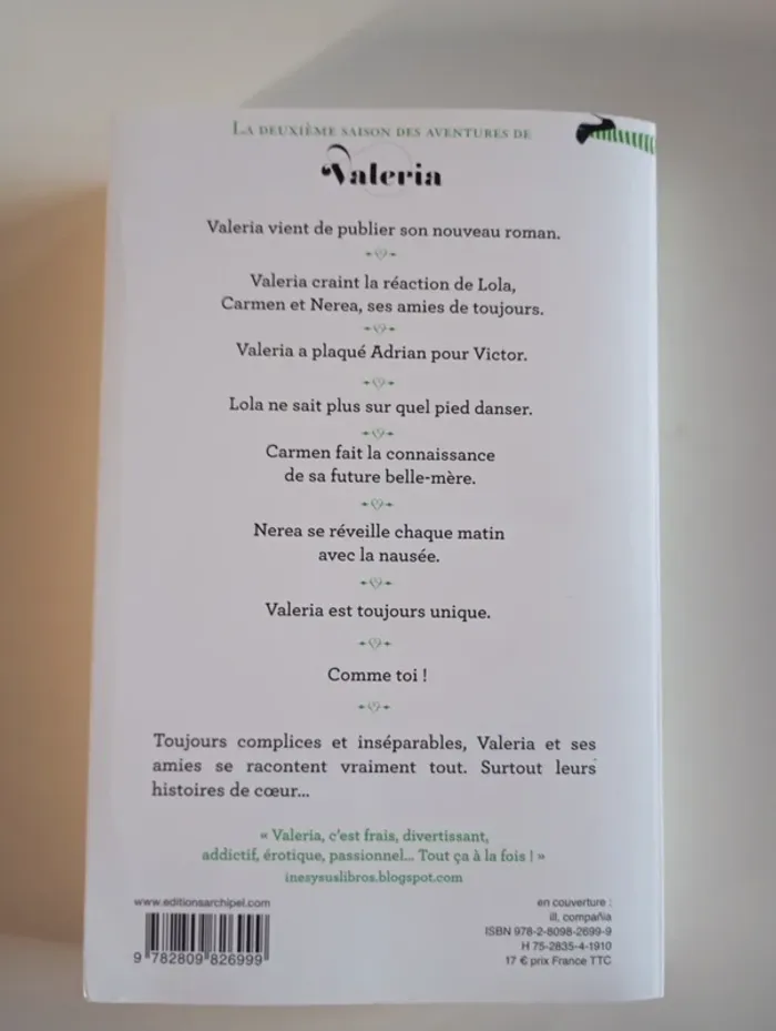 La vie de quatre amies de 27 ans qui se racontent tout, en particulier leurs histoires de cœur. La nouvelle saga addictive, maintenant sur Netflix. La suite trépidante des aventures de Valeria et de sa bande d'amiesValeria, qui s'est séparée d'Adrian, est tombée dans les bras de Victor. Mais, après un début de relation enflammée, elle commence à s'interroger... A-t-elle fait le bon choix ?Heureusement, ses amies de toujours sont là, à qui elle peut se confier. Et réciproquement. Car Lola, elle aussi, se pose des questions. Est-elle encore amoureuse de Sergio, l'homme qui a plaqué sa fiancée pour elle, avant qu'elle le rejette ? Carmen, de son côté, semble heureuse d'avoir enfin franchi le pas avec Barto, même si elle pressent que la mère de ce dernier va se montrer envahissante... Seule Nerea semble garder le cap et la tête froide. Mais les apparences sont souvent trompeuses...Valeria a aussi une autre source d'inquiétude. Elle vient enfin de terminer son deuxième roman. Elle en est satisfaite et son éditeur est enthousiaste. Mais comment ses amies réagiront-elles quand elles découvriront leurs histoires de cœur et leurs ébats intimes étalés au grand jour ? En attendant, les quatre amies sont de nouveau réunies et s'apprêtent à sortir faire la fête.C'est drôle, c'est vif, ça pétille et ça passe aussi vite qu'une soirée entre filles. On s'est à peine embrassées qu'il est déjà l'heure de se quitter. Éditeur ‏ : ‎ L'Archipel Broché - 411 pages Dimensions ‏ : ‎ 12 x 2.9 x 20.1 cm Prix éditeur : 17€ Livre en excellent état Je vends un autre tome #phil_peg_valeria #valeria