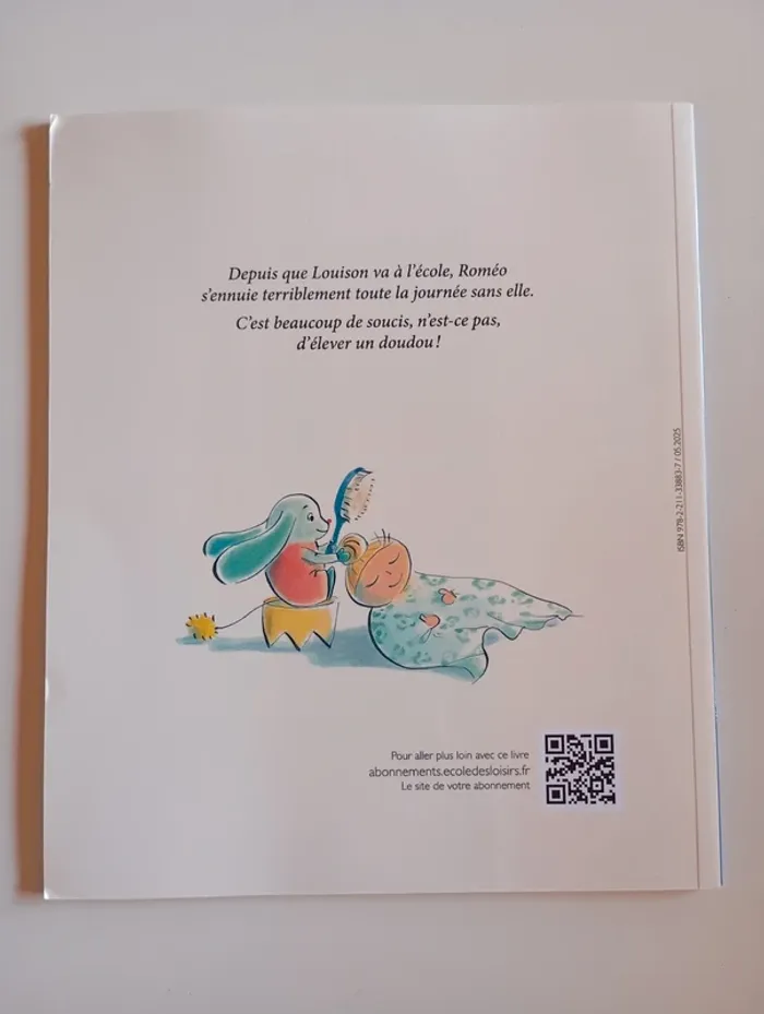 Louison a un doudou qui s’appelle Roméo. Il la suit partout. Un jour, sa maman lui dit que les doudous sont pour les bébés et qu’à son âge, il serait temps de se séparer de Roméo. Hélas, il ne l’entend pas de cette oreille… Et si Louison l’occupait en lui apprenant des choses de grands ? Editeur : Ecole des Loisirs 34 pages Dimensions : 22 x 25 cm Âge : 3 - 6 ans Livre en très bon état Je vends d'autres livres de l'école des loisirs #phil_peg_écoledesloisirs #écoledesloisirs #doudou #amitié #imagination