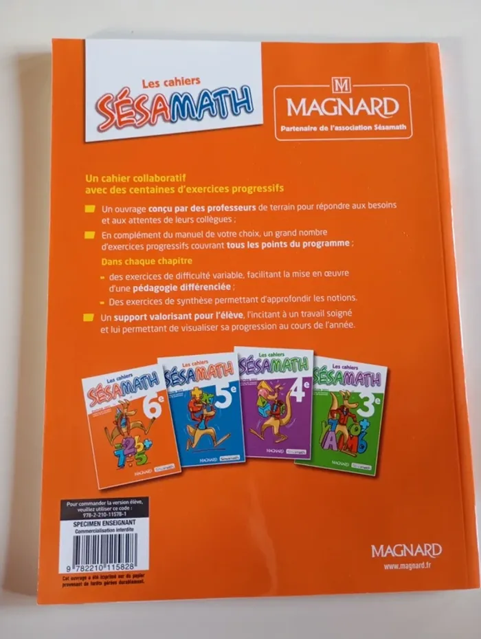 Les cahiers Sésamaths, créés et testés par des centaines de professeurs Dans chaque chapitre, un grand nombre d’exercices progressifs couvrant tous les points du programme : - des exercices de difficulté variable, facilitant la mise en œuvre d’une pédagogie différenciée ; - des exercices de synthèse permettant d’approfondir des notions. Un support valorisant pour l’élève, l’incitant à un travail soigné et lui permettant de visualiser sa progression au cours de l’année Éditeur ‏ : ‎ MAGNARD 128 pages Dimensions ‏ : ‎ 22 x 1 x 29.7 cm Livre en parfait état (Juste un coin plié - Specimen) Je vends d'autres livres scolaires #phil_peg_livrescolaire #maths #manuelscolaire #6e #collège #cycle3