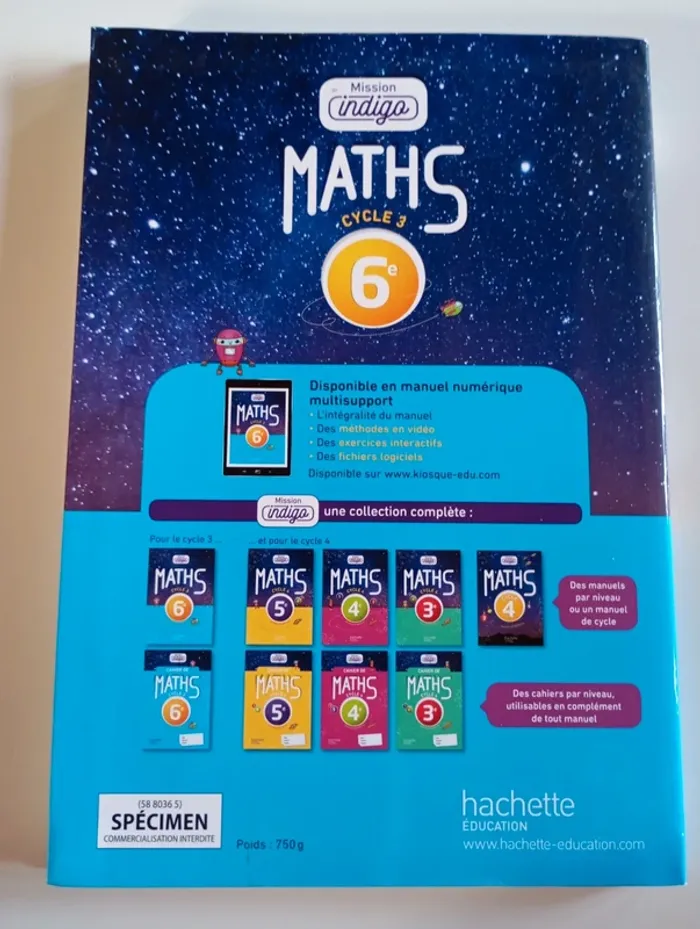 Une progression spiralée sur l'ensemble du cycle. Un manuel conçu pour faciliter la différenciation pédagogique et l'AP. Une grande progressivité des exercices, avec du calcul mental et des exercices techniques sur chaque capacité. Des problèmes motivants, concrets et de nombreuses prises d'initiatives, pour former tous les élèves à la résolution de problèmes. Un accent mis sur l'algorithmique et les outils numériques. Éditeur ‏ : ‎ Hachette Éducation 304 pages Dimensions ‏ : ‎ 19.8 x 1.7 x 28.4 cm Livre en excellent état (Specimen) Je vends d'autres livres scolaires #phil_peg_livrescolaire #mathématiques #manuelscolaire #6è #cycle3