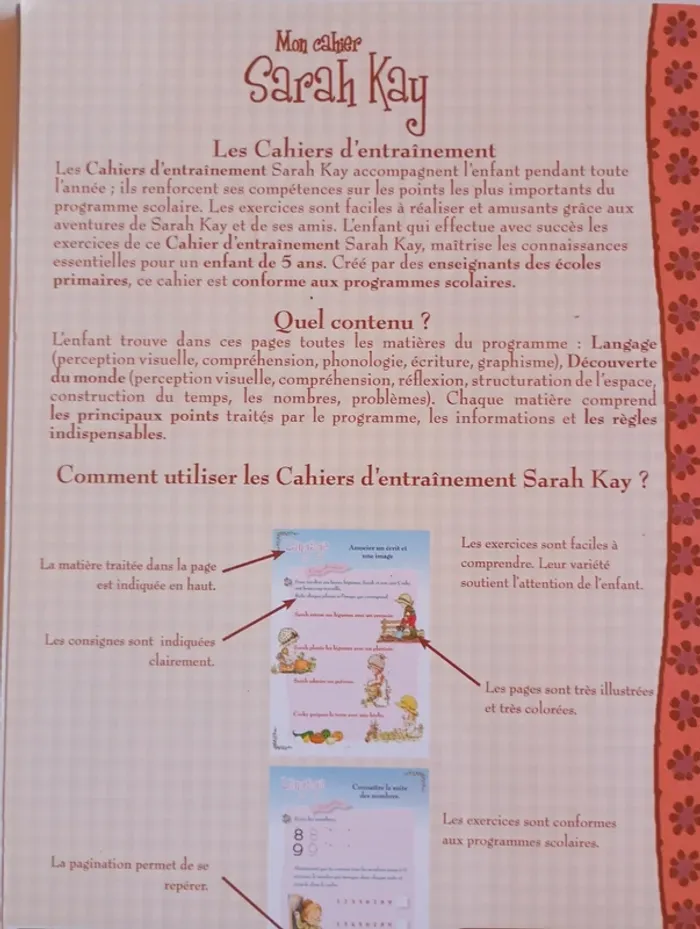 Les Cahiers d'entraînement Sarah Kay accompagnent l'enfant pendant toute l'année ; ils renforcent ses compétences sur les points les plus importants du programme scolaire. Les exercices sont faciles à réaliser et amusants grâce aux aventures de Sarah Kay et de ses amis. L'enfant qui effectue avec succès les exercices de ce Cahier d'entraînement Sarah Kay, maîtrise les connaissances essentielles pour un enfant de 5 ans. Créé par des enseignants des écoles primaires, ce cahier est conforme aux programmes scolaires. L'enfant trouve dans ces pages toutes les matières du programme : Langage (perception visuelle, compréhension, phonologie, écriture, graphisme), Découverte du monde (perception visuelle, compréhension, réflexion, structuration de l'espace, construction du temps, les nombres, problèmes). Chaque matière comprend les principaux points traités par le programme, les informations et les règles indispensables. Éditeur ‏ : ‎ Eclairs de Plume 48 pages Âge de lecture ‏ : ‎ Dès 5 ans Dimensions ‏ : ‎ 20.5 x 0.3 x 28 cm Livre en excellent état Je vends un autre livre de Sarah Kay #phil_peg_sarahkay #sarahkay #grandesection #cp