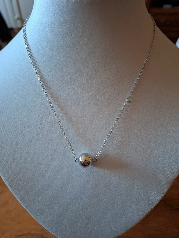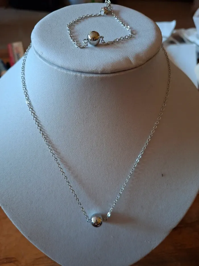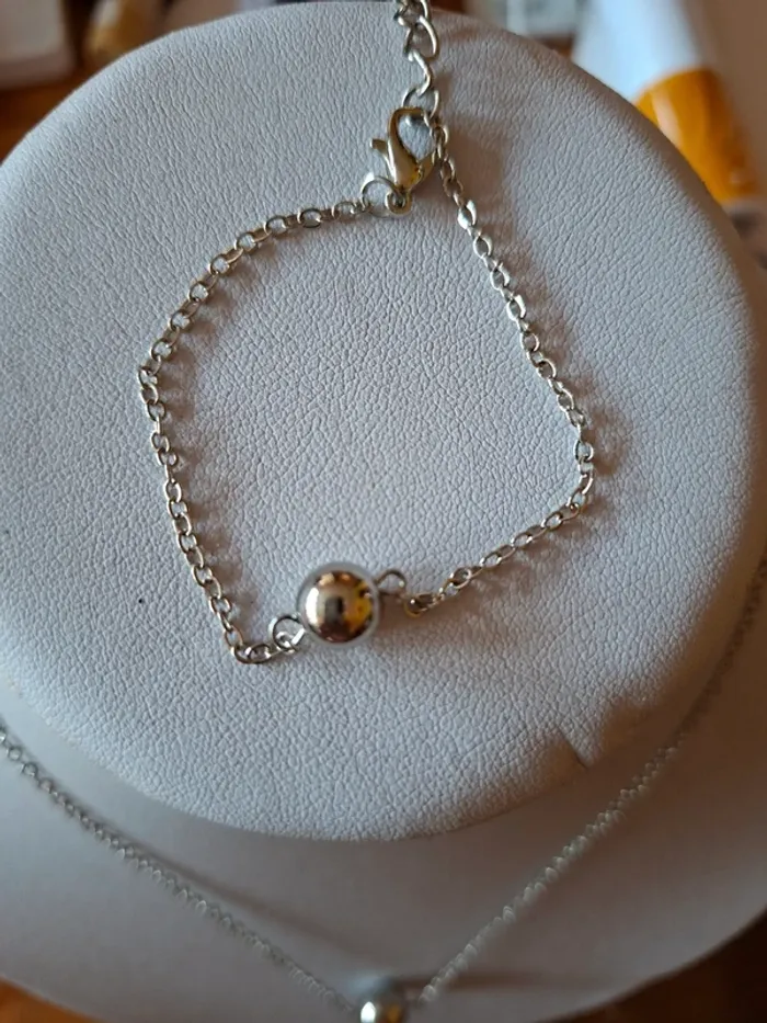 Bonjour, Je vends un très joli ensemble de bijoux pour femme, comprenant un collier et un bracelet assorti. Les deux pièces sont de couleur argentée et sont ornées d'une "perle" ronde et brillante. Les chaînes sont fines et élégantes, et les deux bijoux sont dotés d'un fermoir à mousqueton avec une chaînette d'extension, ce qui permet d'ajuster la longueur à votre convenance. L'ensemble est en excellent état, très peu porté. Idéal pour une idée cadeau ou pour compléter une tenue avec une touche de finesse et d'élégance.