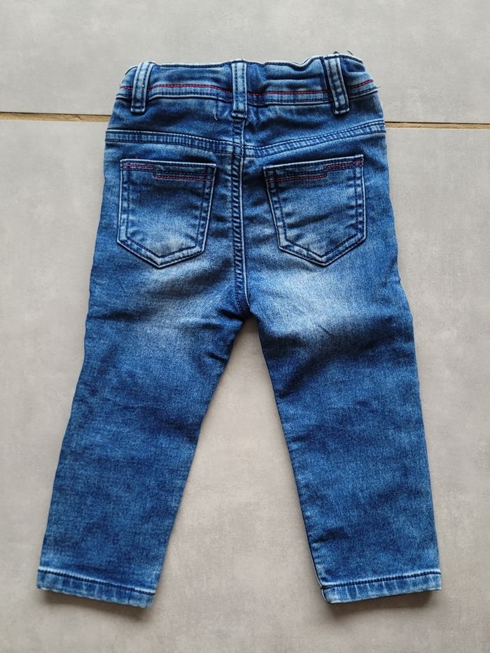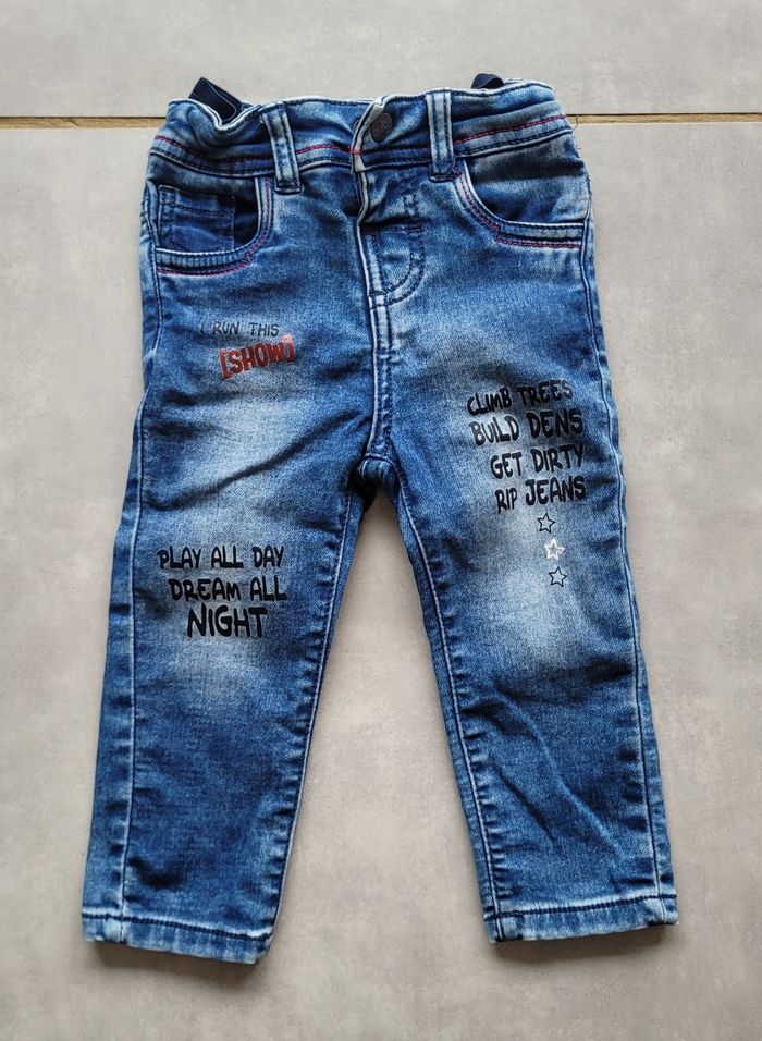 Jean de couleur bleu, légèrement délavé avec inscription, de la marque Orchestra, taille 9 mois (71 cm), en très bon état. Article lavé pour la vente.