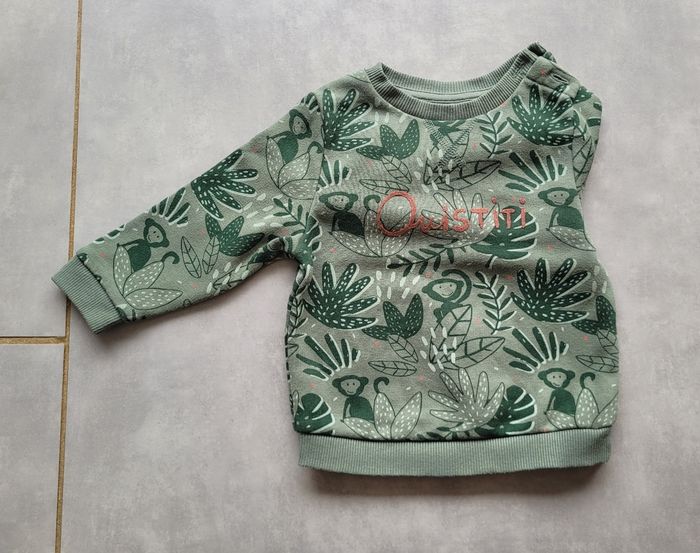 Sweat dans les tons verts, avec inscription, de la marque Tape à l'œil, taille 9 mois (71 cm), en très bon état. Article lavé pour la vente.
