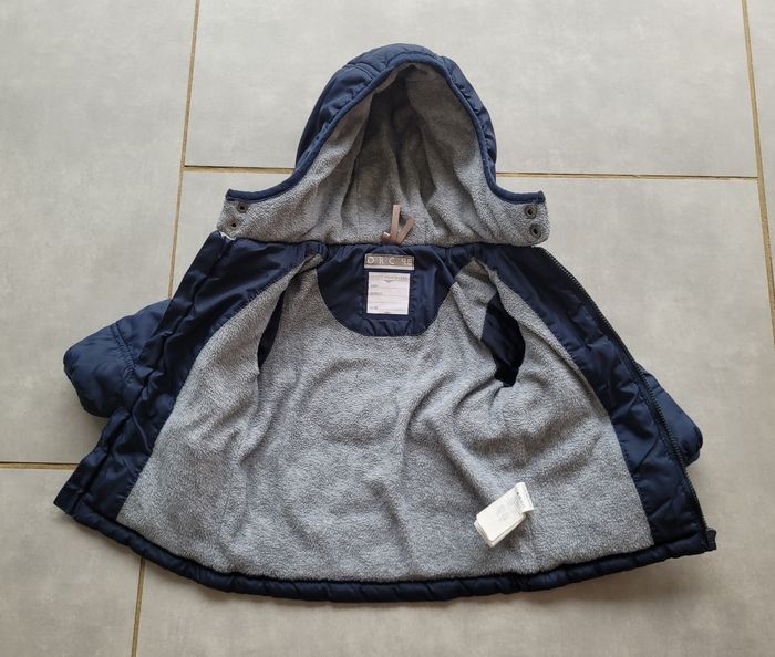 Manteau chaud à capuche, de couleur marine, de la marque Orchestra, taille 9 mois (71 cm), en très bon état. Article lavé pour la vente.