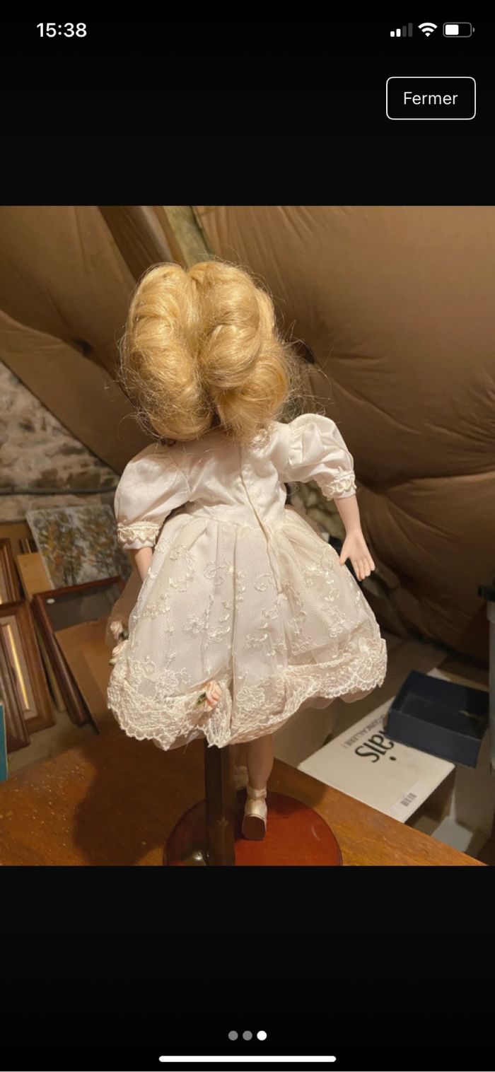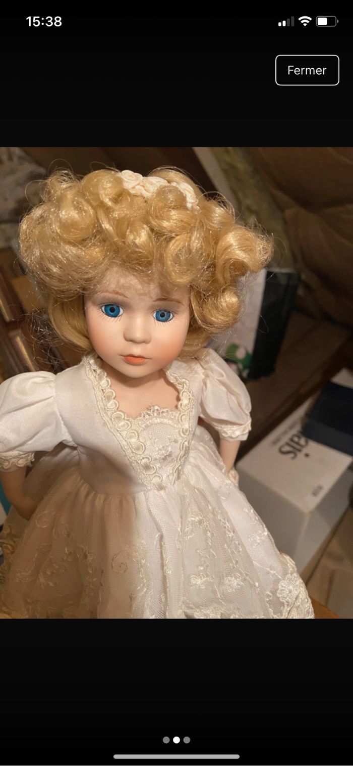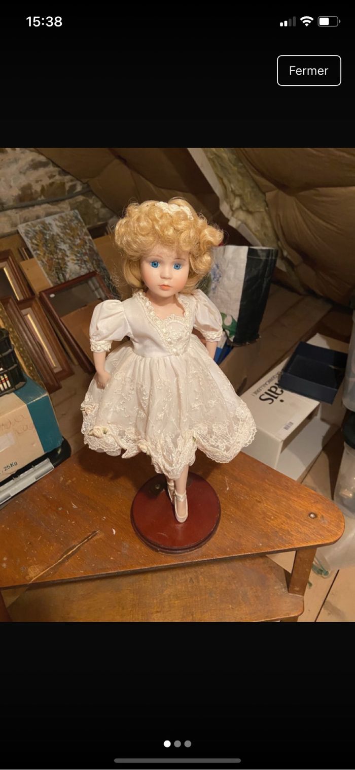 A vendre. Très belle poupée en porcelaine vendue avec son socle en bois. Taille: 42 cm (debout).