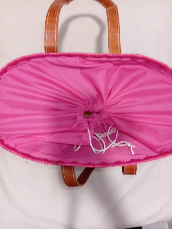 Sac de plage ou autre avec fermeture au-dessus en tissus . Le compartiment portable ou porte feuille est décousu. Les coins extérieurs du sac sont un peu abîmés mais il n'est pas troué voir photos