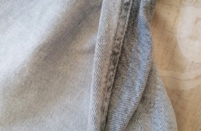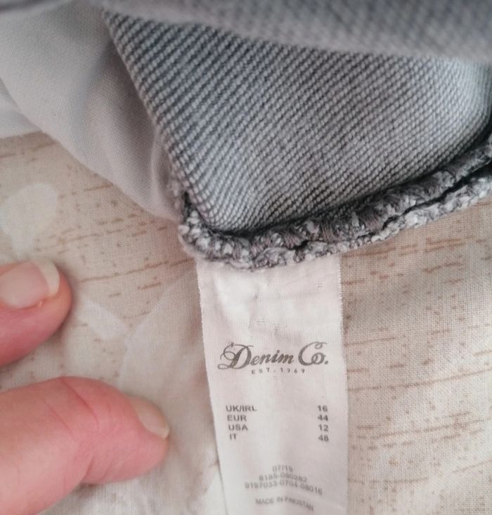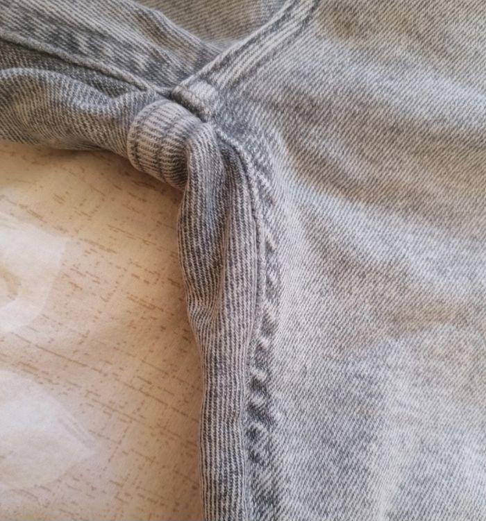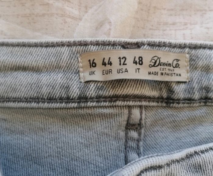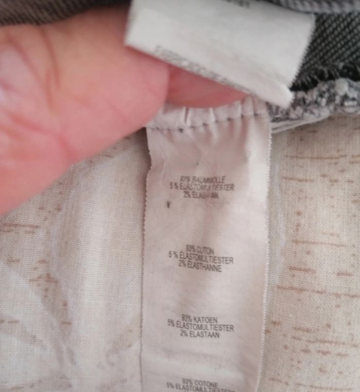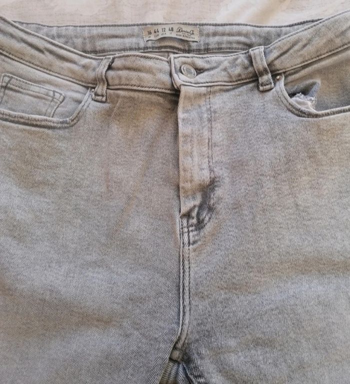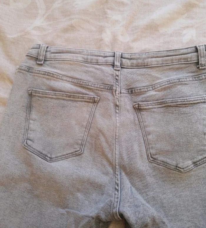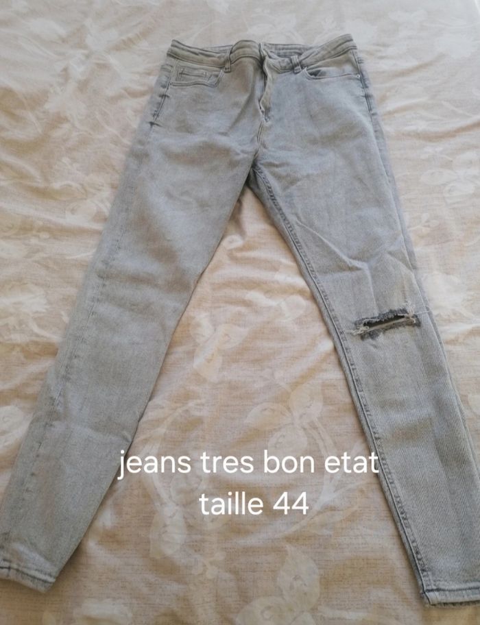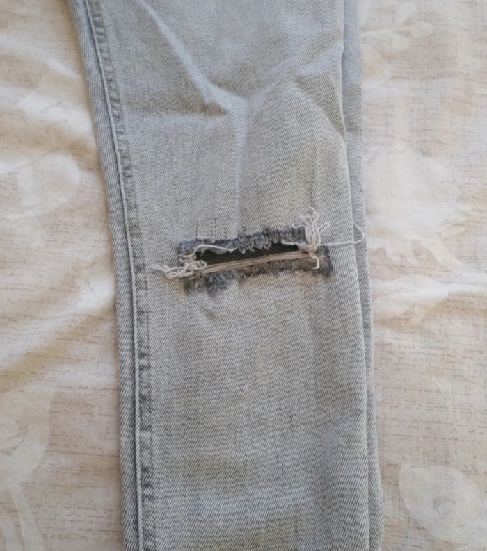 Jeans de taille 44 troué d origine au genou très bon état peu porté Taille haute Aucun signe d usure entre les jambes Couleur gris clair
