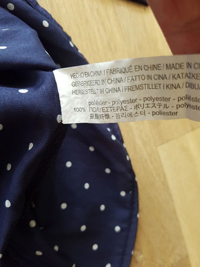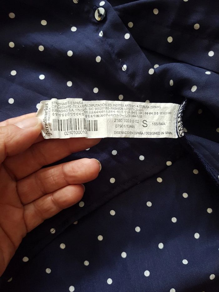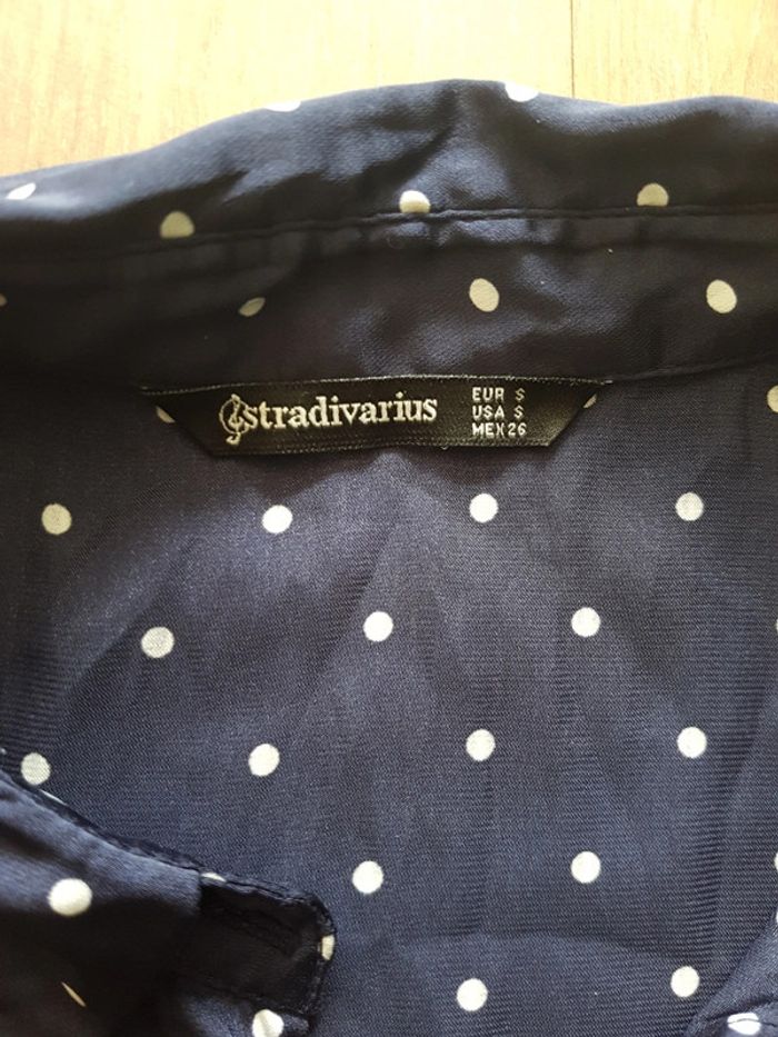 Chemisier manches 3/4 Stradivarius taille S Bleu marine à pois blancs, matière polyester effet satin brillant.