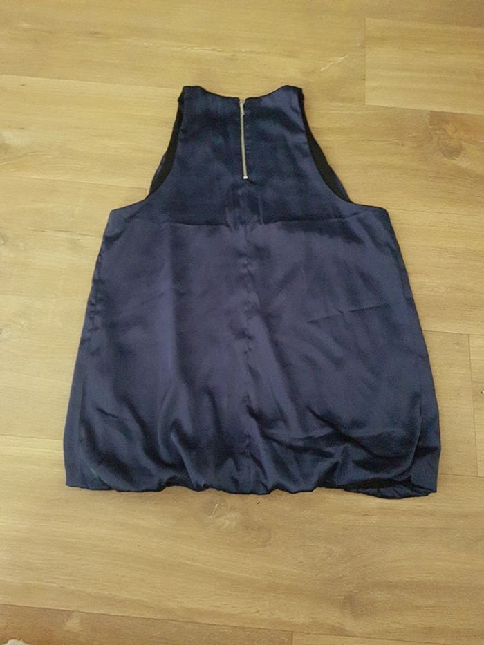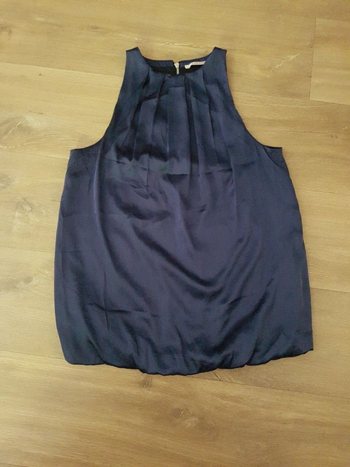 Très joli haut sans manche Camaïeu taille 36, bleu marine avec élastique à la taille et fermeture éclair dans le dos Matière satinée brillante